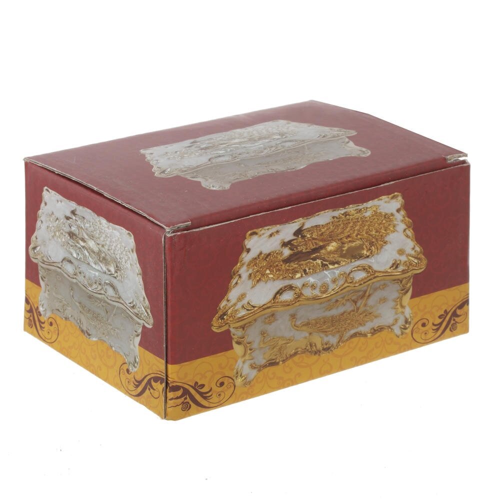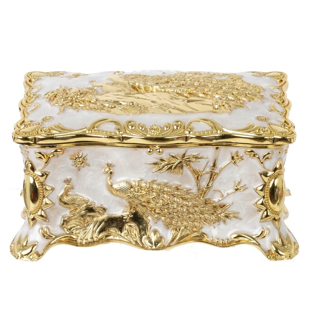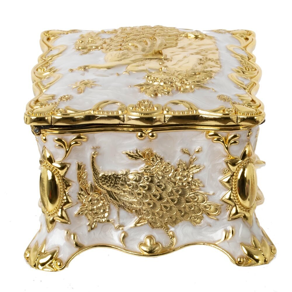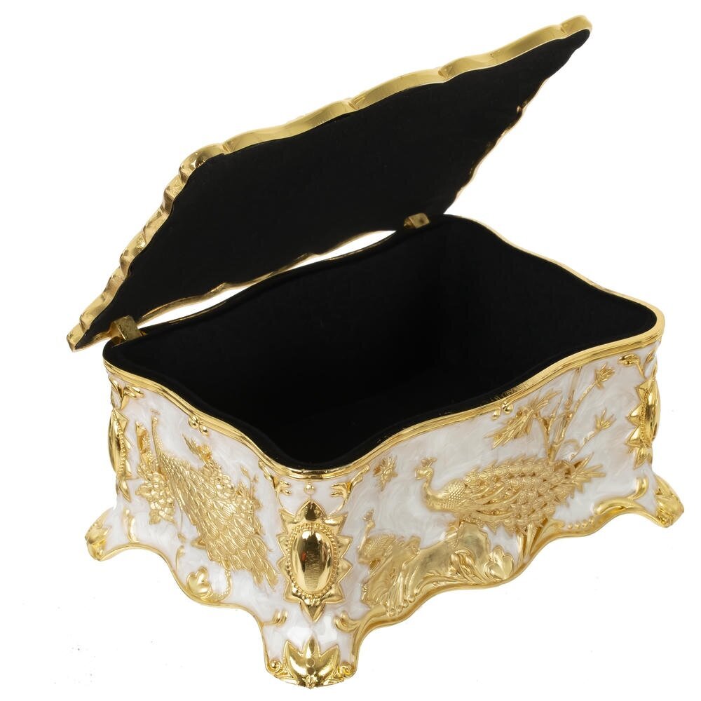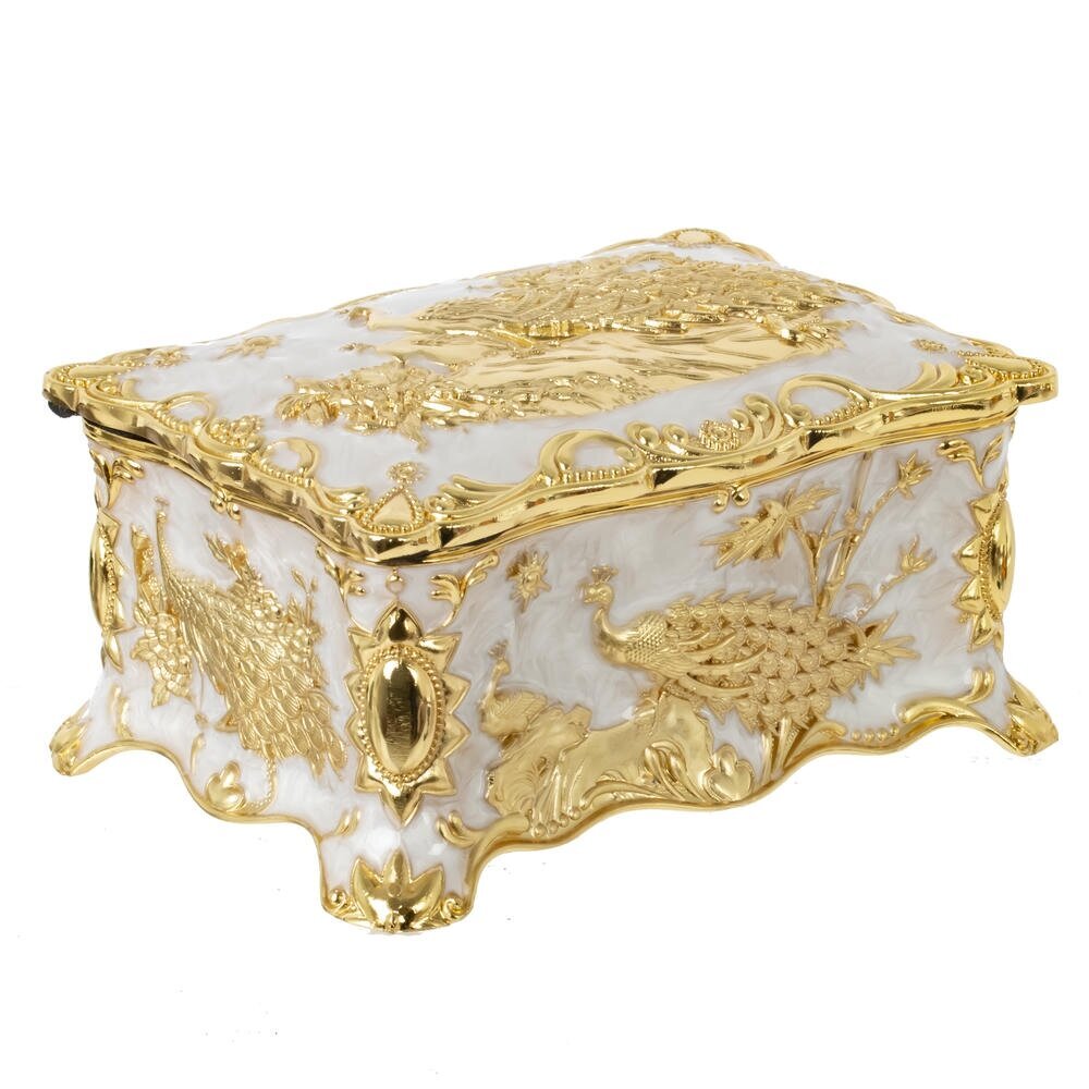 Элегантная металлическая шкатулка с роскошным золотистым покрытием и перламутровым основанием станет выразительным акцентом в любом интерьере. Боковые стенки украшены объемным рельефом с изящными павлинами и флористическими орнаментами, крышка оформлена сложным узором в классическом стиле. Плавные волнистые линии корпуса подчеркивают изысканность формы и придают изделию вид антикварной вещи. Шкатулка идеально подойдет для хранения украшений, дорогих мелочей и памятных сувениров, а также станет эффектным подарком на праздник или торжественное событие.
