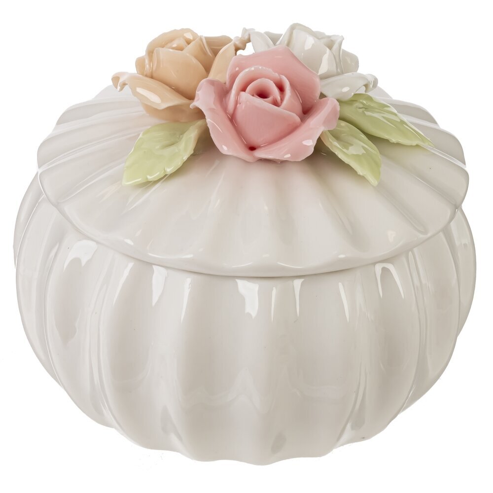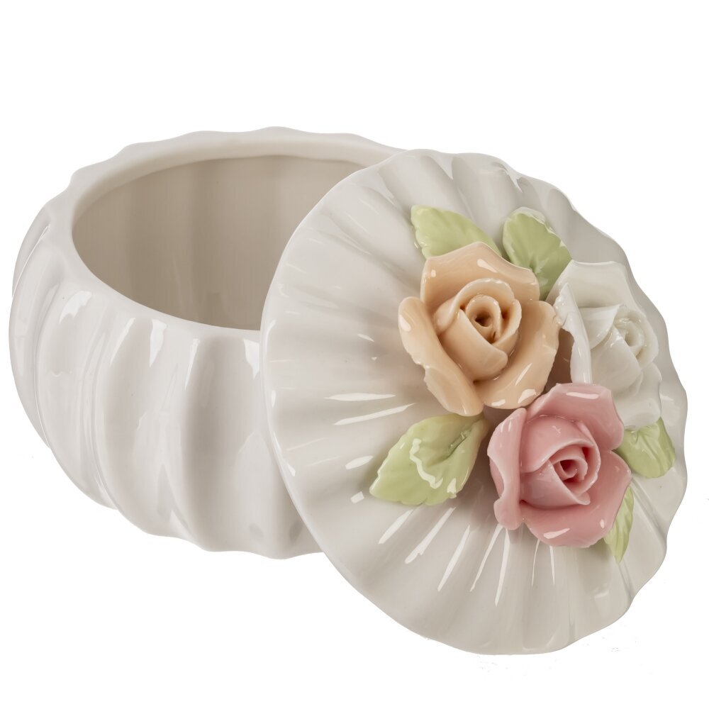 Эта изысканная шкатулка, выполненная из качественного фарфора, является настоящим произведением искусства и станет великолепным дополнением вашего интерьера. Она достаточно компактна, чтобы гармонично вписаться в любой уголок вашего дома, от туалетного столика до книжной полки. Круглая форма шкатулки придаёт ей особую элегантность, а её аккуратно сконструированная крышка не только защищает содержимое, но и служит стильным элементом декора. На крышке розовые цветы, символизирующие красоту и гармонию. Эти детали выполнены с потрясающей аккуратностью и детальностью, что делает каждую шкатулку уникальной. Фарфор, из которого изготовлена шкатулка, обеспечивает ей долговечность и лёгкость в уходе. Внутри шкатулка идеально подходит для хранения мелких предметов, таких как украшения, пуговицы, или даже небольшие записки. Такой аксессуар не только практичен, но и способен поднимать настроение, ведь его изящный дизайн и красивое оформление создают атмосферу уюта и комфорта.