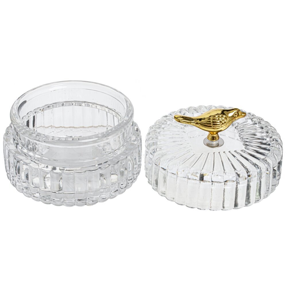 Эта стеклянная шкатулка с рельефной поверхностью и крышкой - прекрасное дополнение к вашему интерьеру. Ее компактные размеры позволяют легко разместить ее на полке, столе или комоде. Шкатулка идеально подходит для хранения маленьких предметов, украшений или других ценностей. Ее стеклянная конструкция придает ей изысканность и элегантность, а золотая фигурка птицы на крышке добавляет нотку роскоши и изысканности. Эта шкатулка станет прекрасным подарком или украшением вашего дома.
