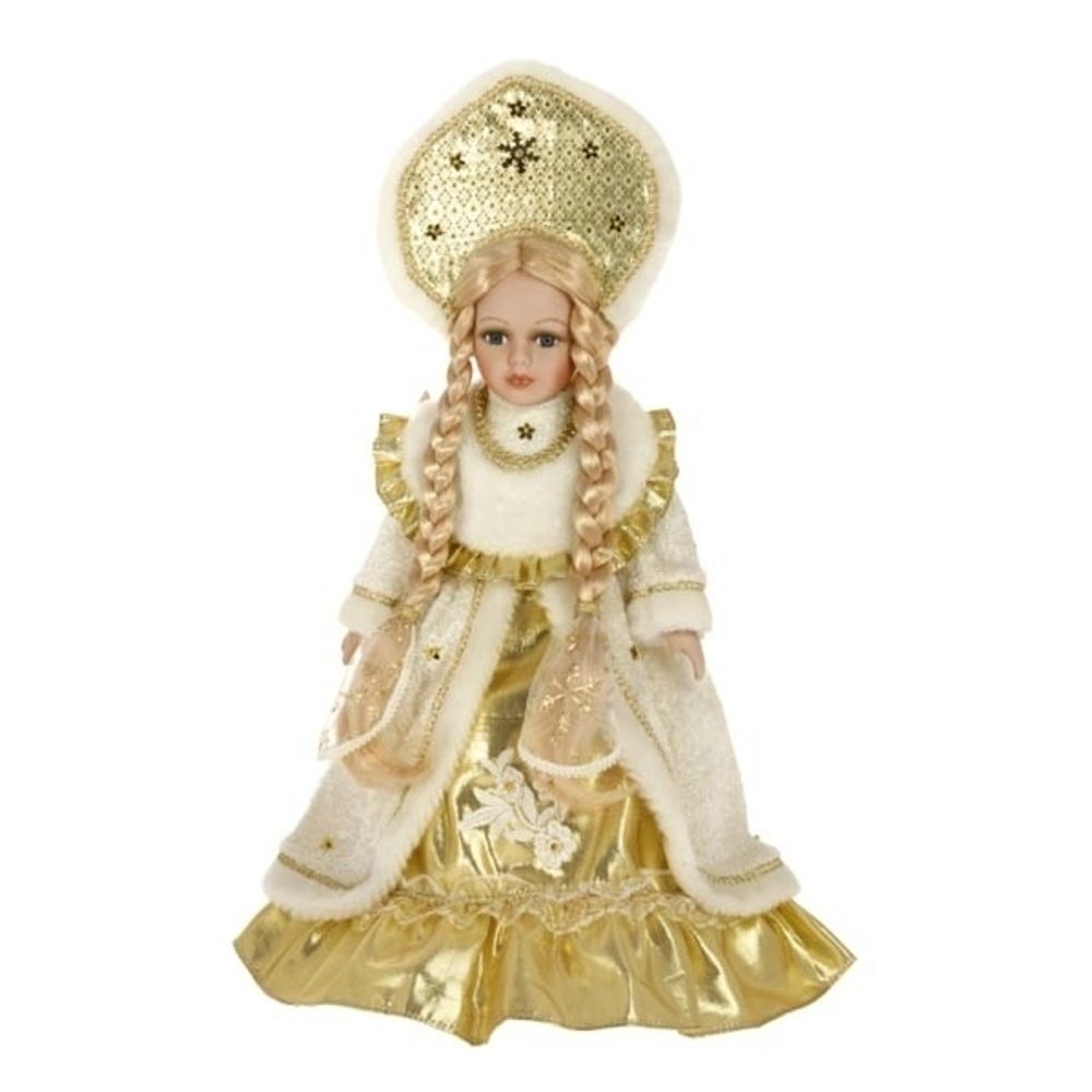 Снегурочка в роскошном золотом наряде с меховой отделкой и кокошнике будет прекрасным подарком к Новому году. Ее можно поставить под елку, а так же использовать как милый подарок.