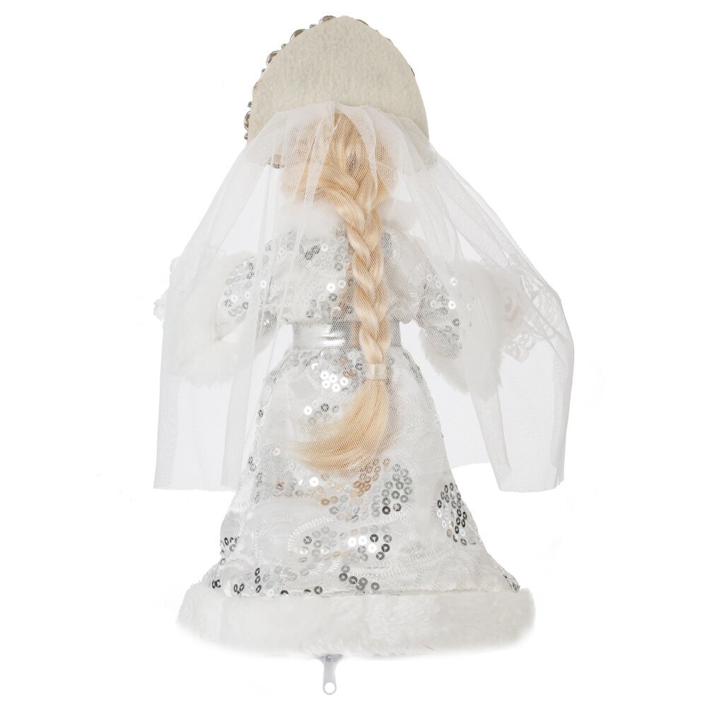Снегурочка с ёмкостью для конфет — это невероятно красивая декоративная кукла высотой 35 см. Её изящное лицо и кисти рук выполнены из полимерных материалов. Она облачена в роскошный белый наряд с меховой отделкой, украшенной серебристыми деталями. На голове Снегурочки кокошник с фатой, а длинная светлая коса добавляет её образу очарования. Под платьем находится ёмкость для конфет, что делает эту куклу прекрасным подарком для маленьких и больших любителей сладостей.