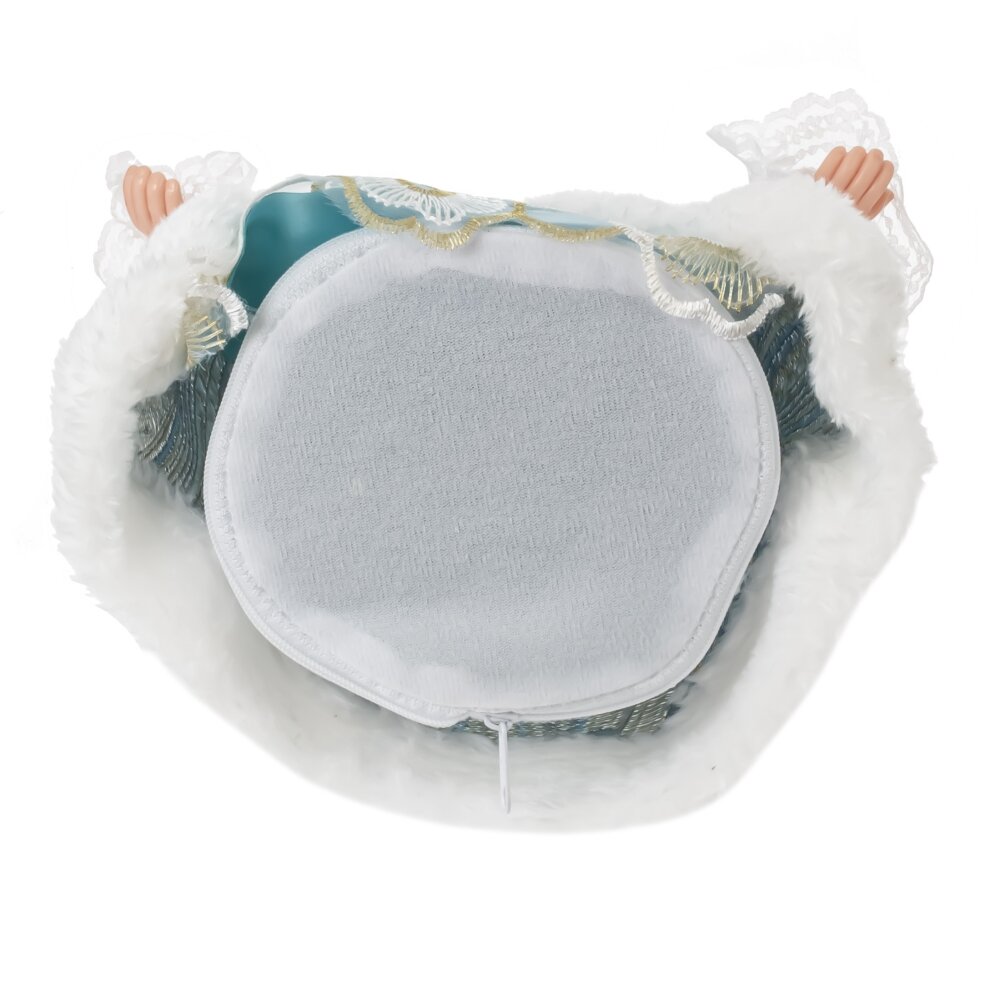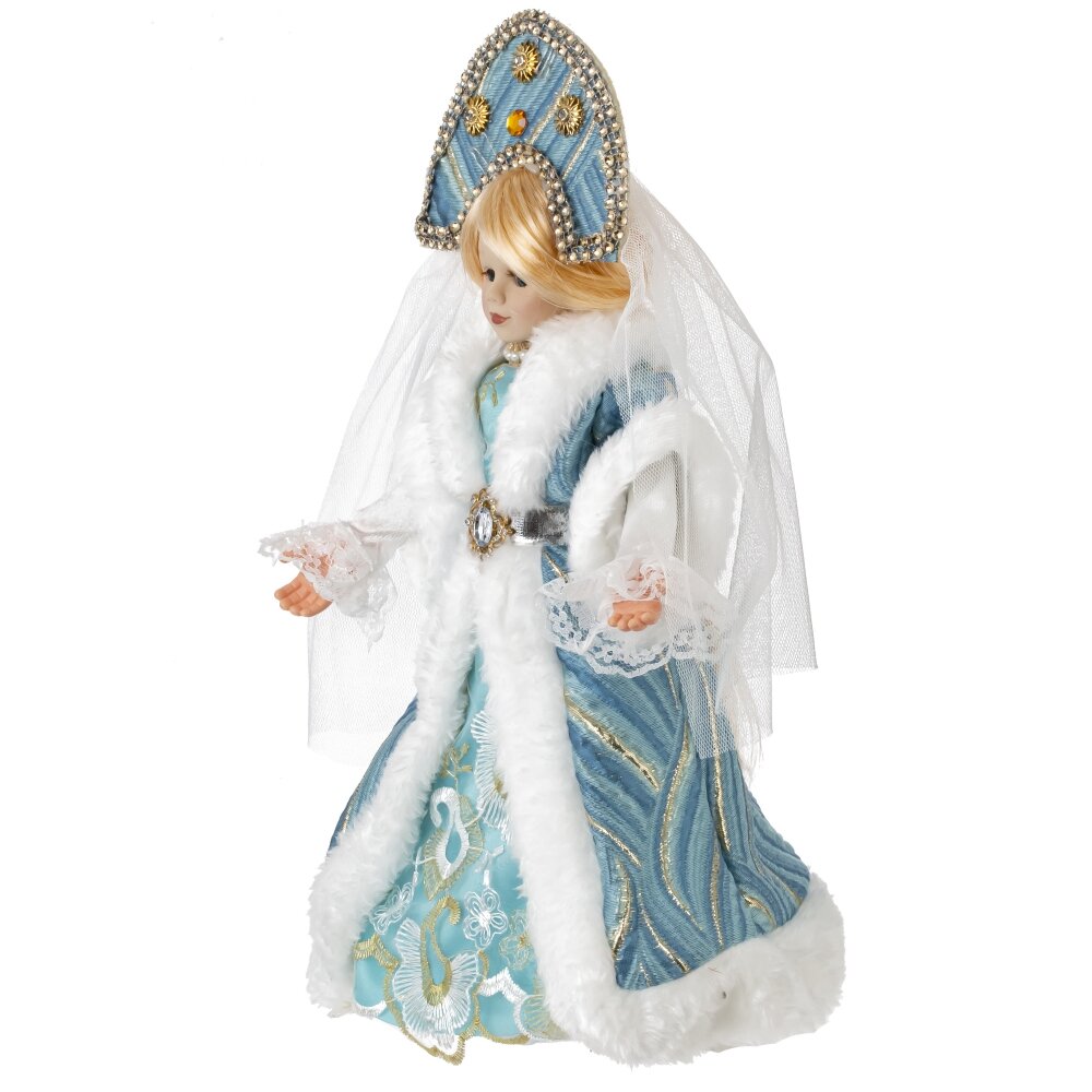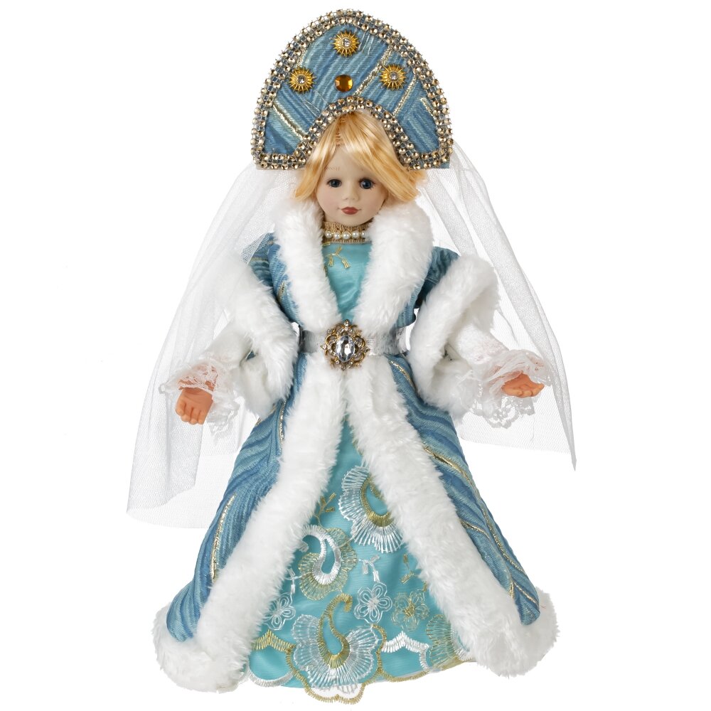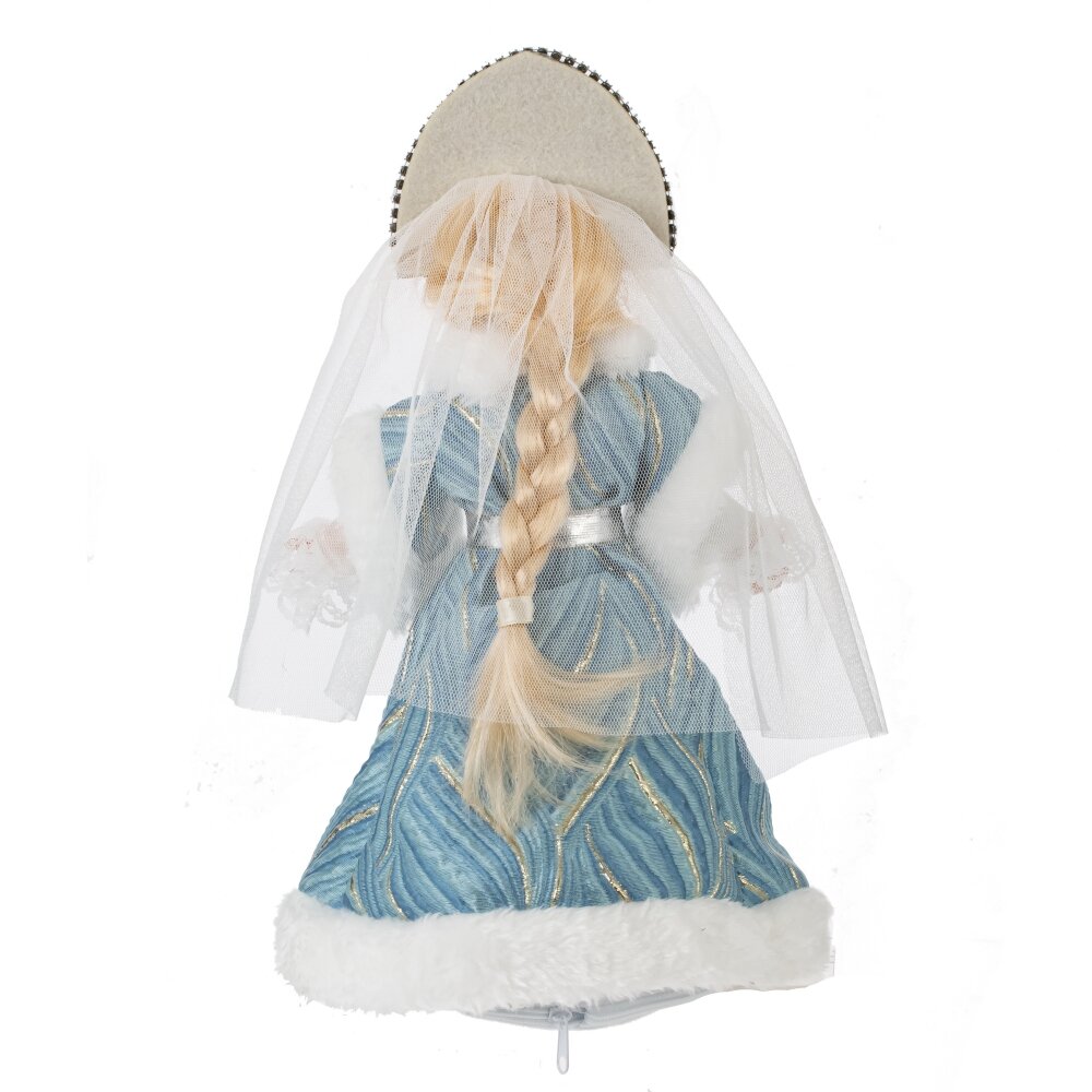 Снегурочка в роскошном наряде — это декоративная кукла, сочетающая в себе элементы русской народной культуры и современный дизайн. Её лицо и руки выполнены из полимерных материалов, что придаёт ей реалистичность. Кукла одета в красивую шубу и платье нежно-голубого цвета, расшитые золотыми нитями. Кокошник со стразами, фата и длинная русская коса до пояса добавляют её образу утонченности. Под платьем находится ёмкость для конфет, что делает Снегурочку чудесным подарком для детей и взрослых, наполняя праздник атмосферой волшебства и приятных моментов.