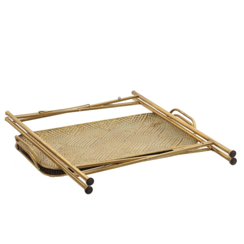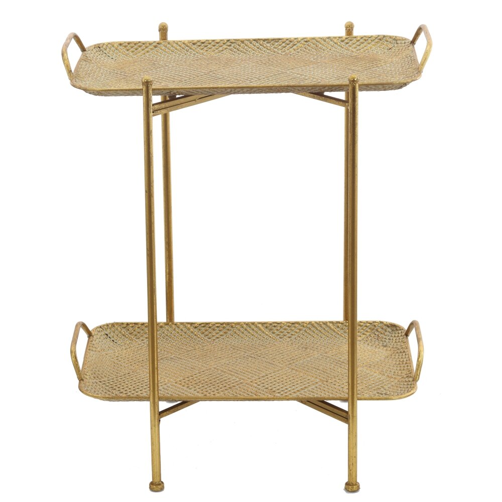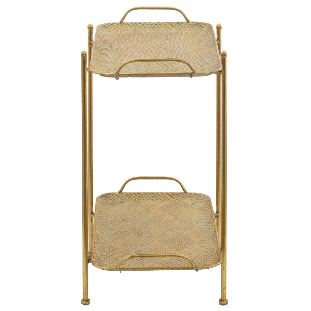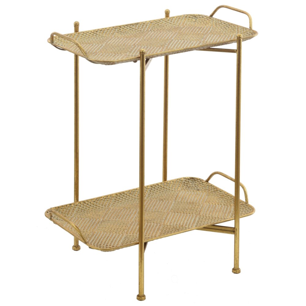 Элегантный декоративный стол из металла в золотистом оттенке станет стильным акцентом в современном интерьере. Конструкция включает две прямоугольные полки с изящным рельефным узором и слегка приподнятыми бортиками, что предотвращает падение предметов. Тонкие стойки и аккуратные ножки придают модели визуальную лёгкость, не перегружая пространство. Столик идеально подойдёт для размещения декоративных аксессуаров, комнатных растений, свечей или небольших книг. Компактный размер позволяет использовать его в гостиной, спальне, прихожей или на балконе, а прочный металл обеспечивает долговечность и простоту ухода.