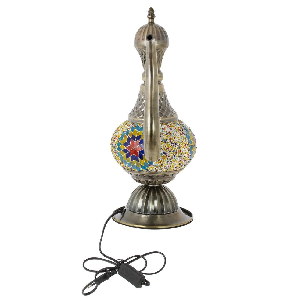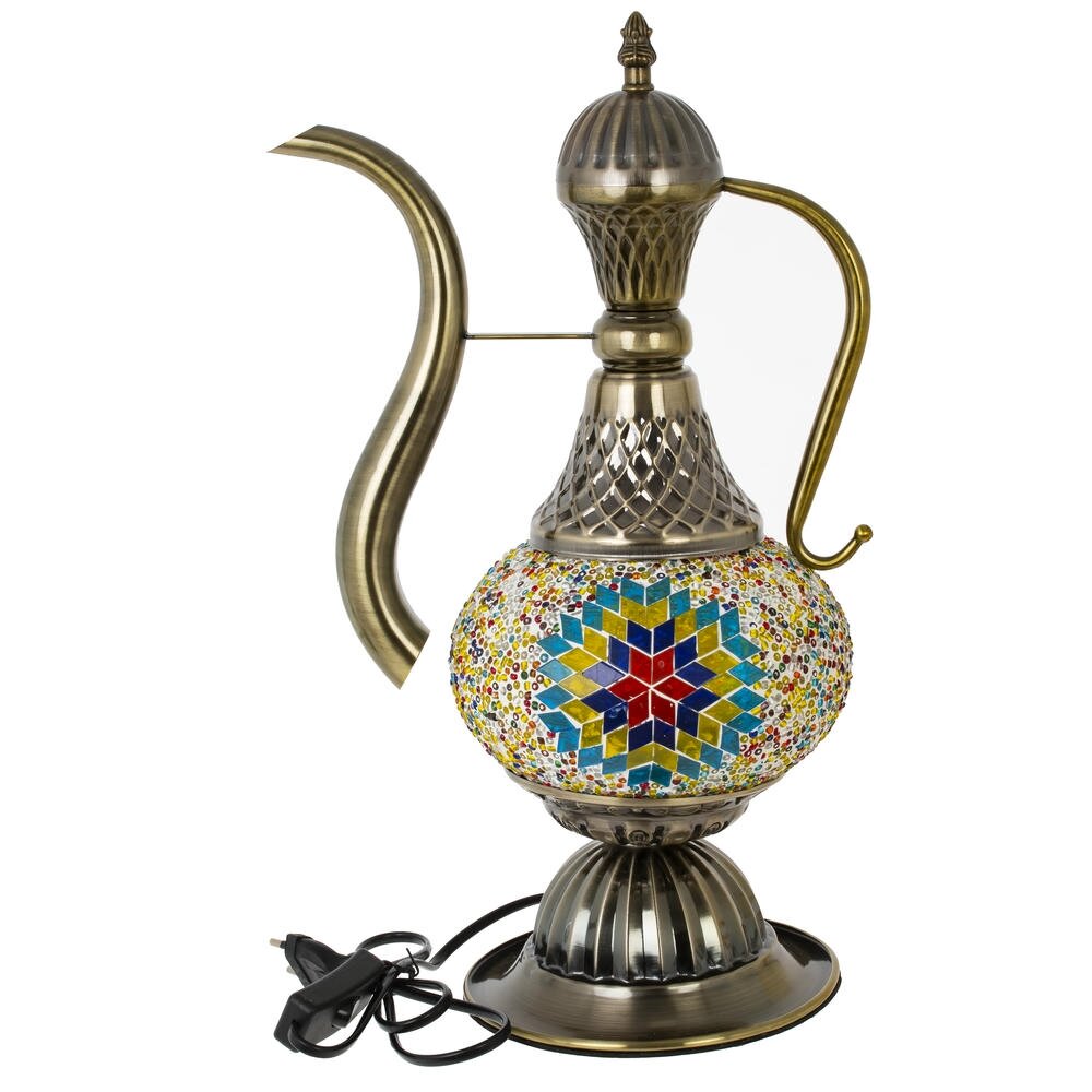 Настольный светильник в восточном стиле, выполненный в форме изящного кувшина, станет эффектным акцентом любого интерьера. Корпус из металла с покрытием «под бронзу» гармонично сочетается с ярким плафоном, украшенным мозаикой из разноцветных стеклянных и полимерных элементов. При включении свет мягко рассеивается через мелкие декоративные вставки, создавая уютную атмосферу и игру бликов на стенах. Светильник рассчитан на лампу с цоколем Е14 и легко подключается к сети с помощью шнура длиной 1,07 м. Подойдёт для гостиной, спальни, кабинета или кафе в этническом и классическом стиле, а также станет оригинальным подарком и стильным элементом декора.