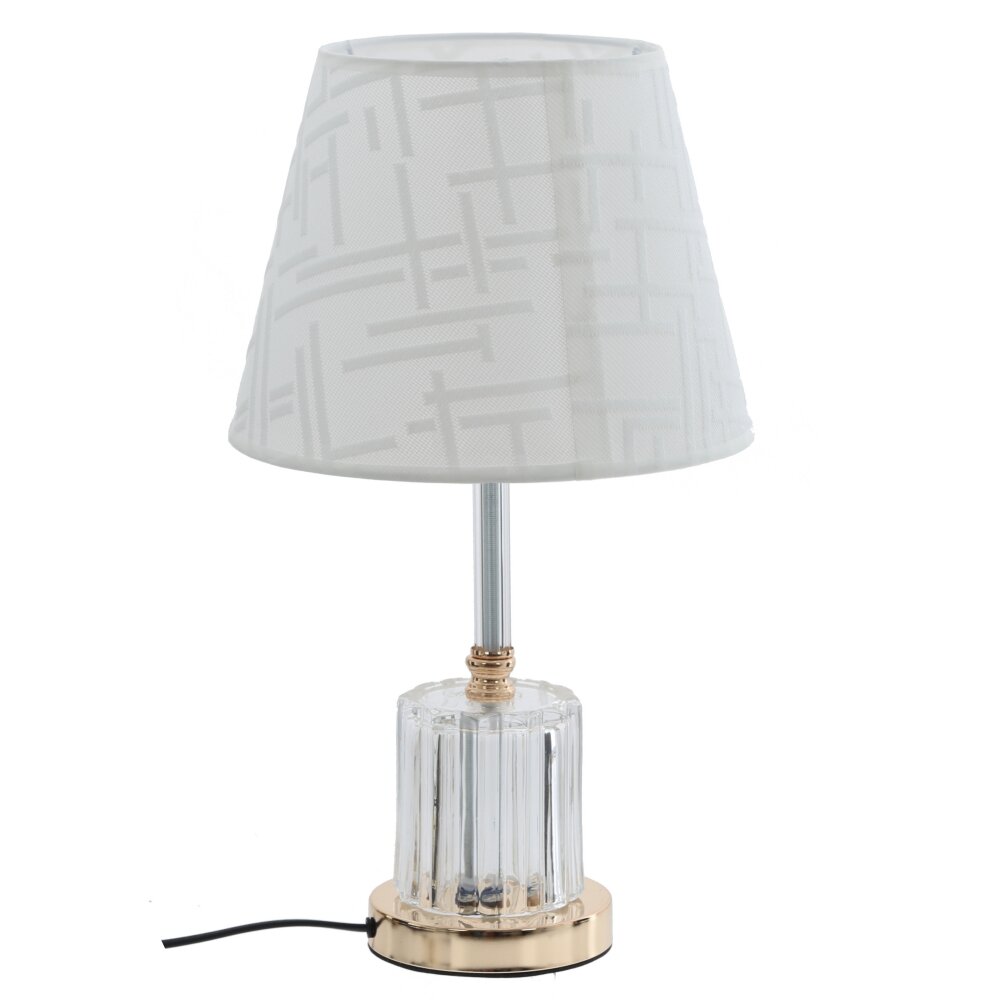 Настольный светильник в современном стиле станет элегантным акцентом для спальни, гостиной или рабочего стола. Модель рассчитана на лампу с цоколем Е27, что позволяет использовать как светодиодные, так и энергосберегающие лампы нужной яркости. Плафон конической формы выполнен из текстильного материала нежного светлого оттенка с лаконичным геометрическим рисунком, создающим мягкое рассеянное освещение. Основание сочетает прозрачный рифлёный полимер, имитирующий стекло, и металлические элементы с благородным глянцевым покрытием. Шнур длиной 1,08 м обеспечивает удобное подключение к розетке, позволяя разместить светильник практически в любом месте интерьера. Идеален для создания уютной атмосферы и дополнительного точечного освещения.