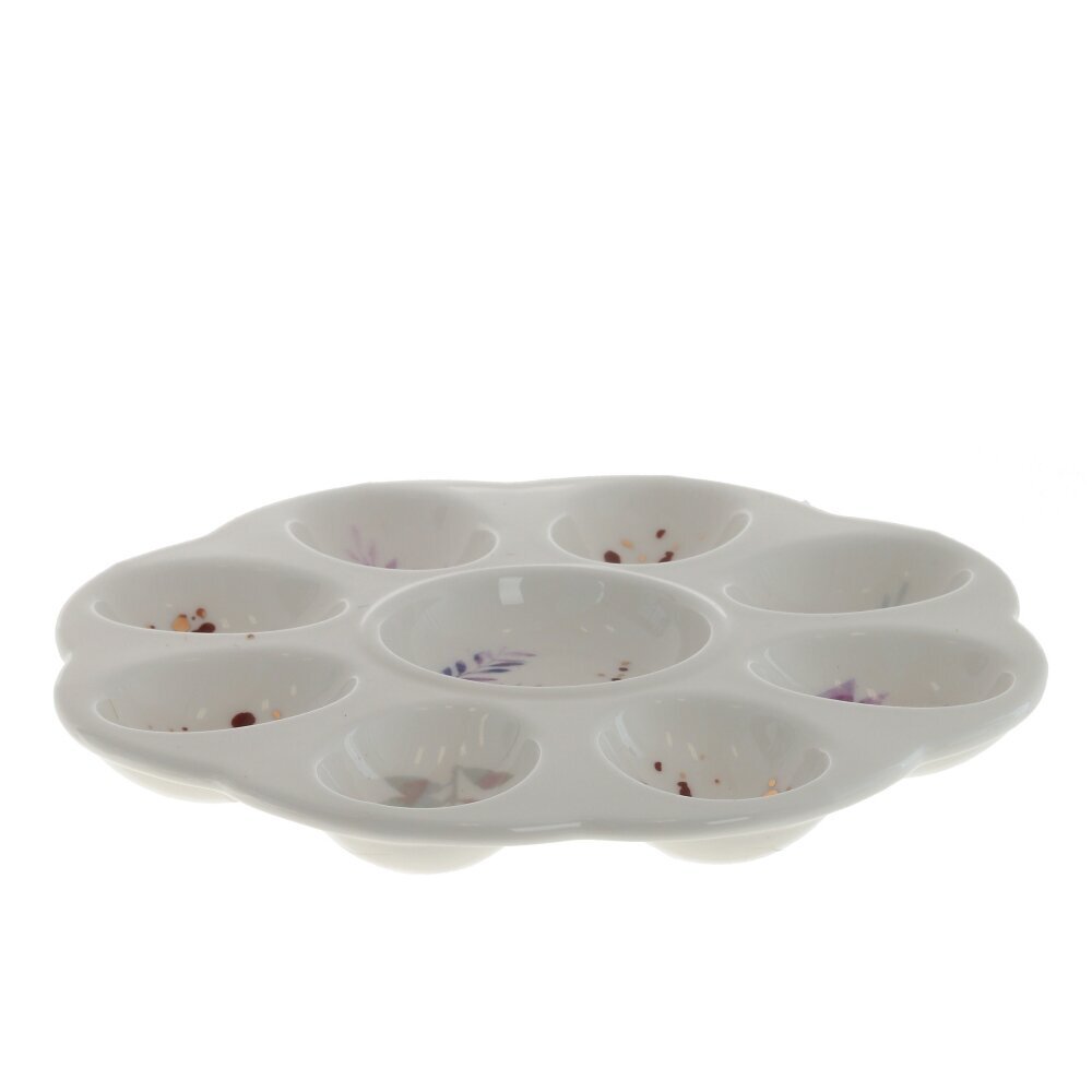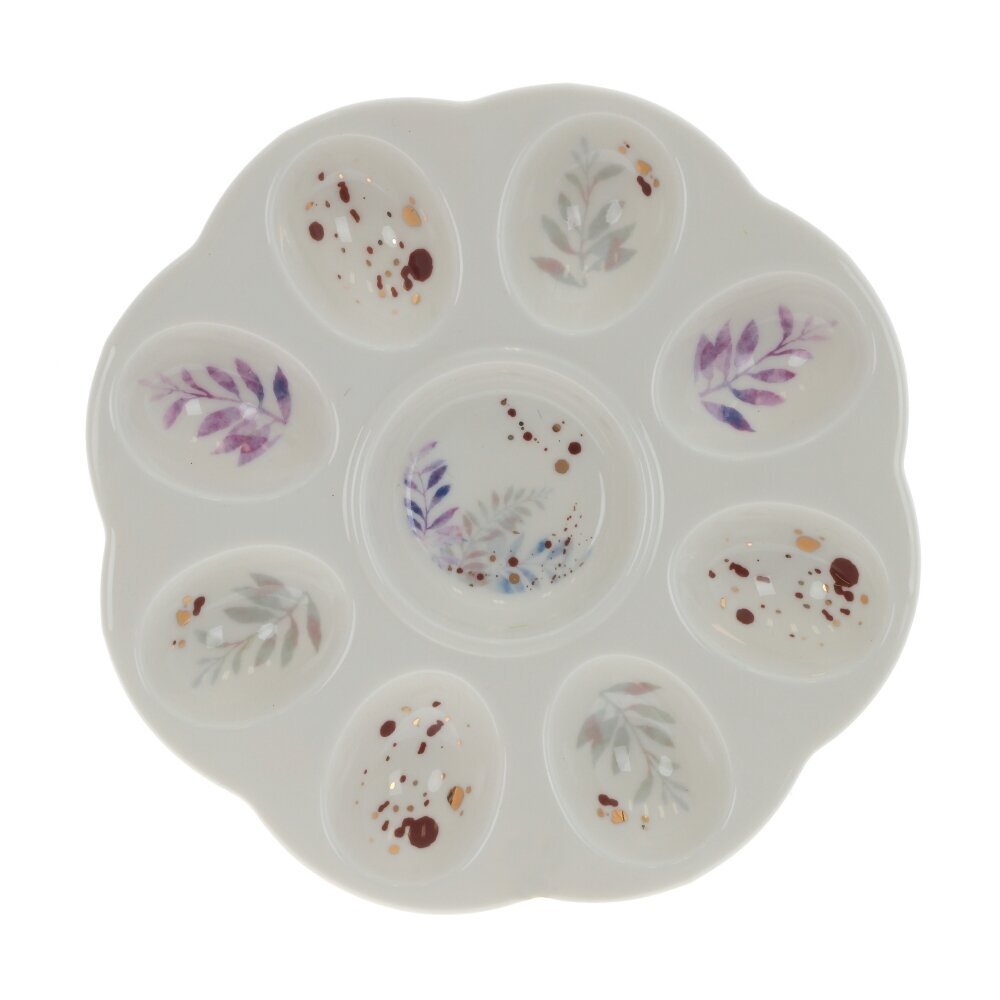 Представляем вам прекрасное дополнение для пасхальной традиции - тарелку для яиц. Изделие имеет круглую форму и изготовлена из качественного фарфора. Но что делает эту тарелку особенной, так это ее цветочный декор, который добавляет нотку нежности. Эта пасхальная тарелка идеально подходит для размещения восьми окрашенных яиц, создавая великолепное праздничное настроение на вашем столе.