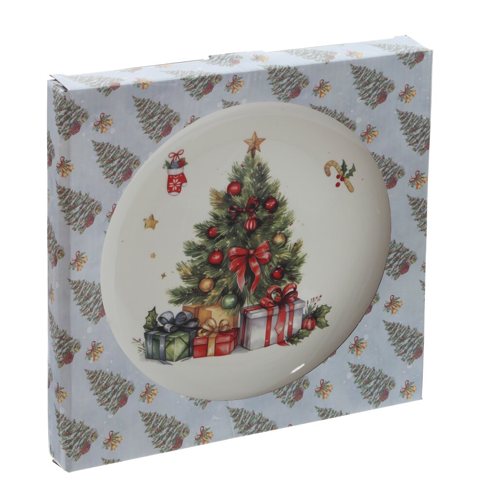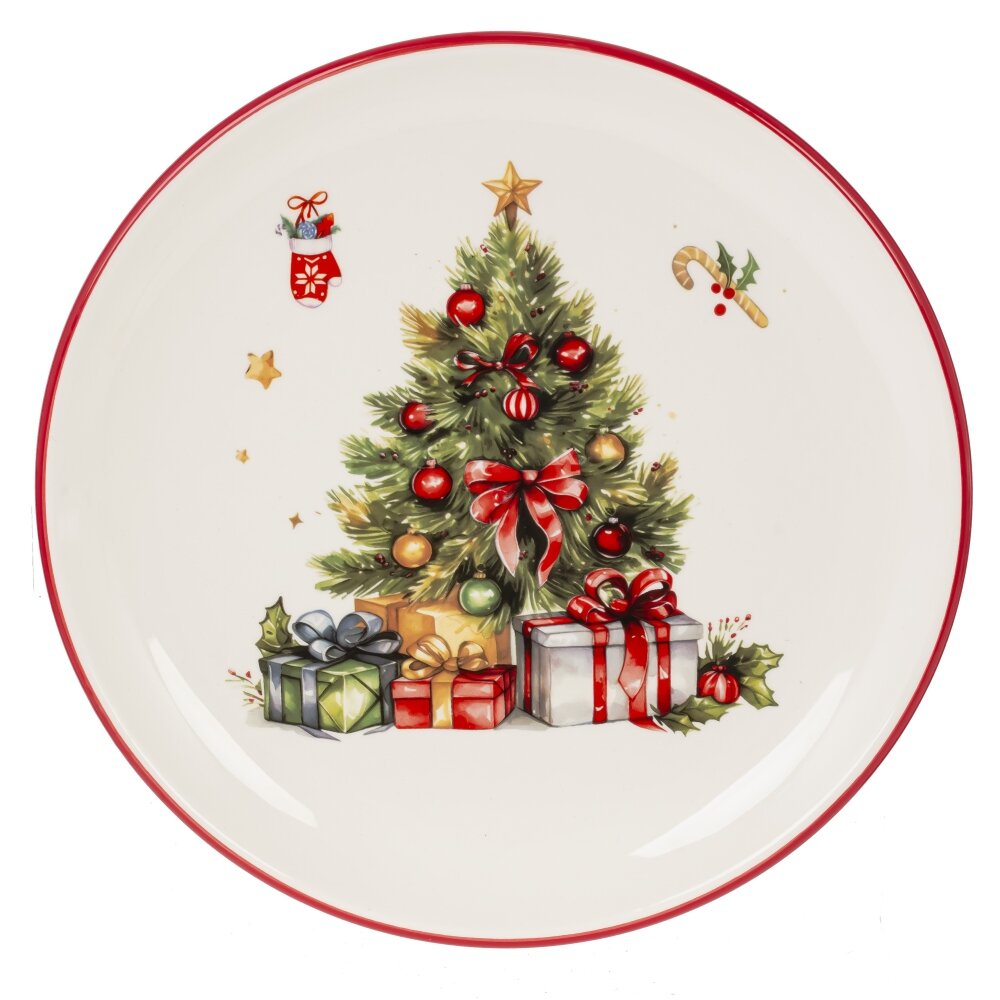 Керамическая тарелка с ярким новогодним дизайном в виде наряженной новогодней ёлки — это не просто посуда, а элемент праздничного декора, способный создать волшебное настроение. Стильный сюжет в традиционных рождественских цветах — красном, зелёном и белом — напоминает о семейных традициях, подготовке к празднику и тепле домашнего очага. Тарелка выполнена из прочной керамики, устойчива к царапинам и перепадам температур, подходит для подачи закусок, десертов или выпечки. Благодаря своему оригинальному оформлению она станет украшением любого праздничного стола и отличным подарком на Новый год или Рождество.