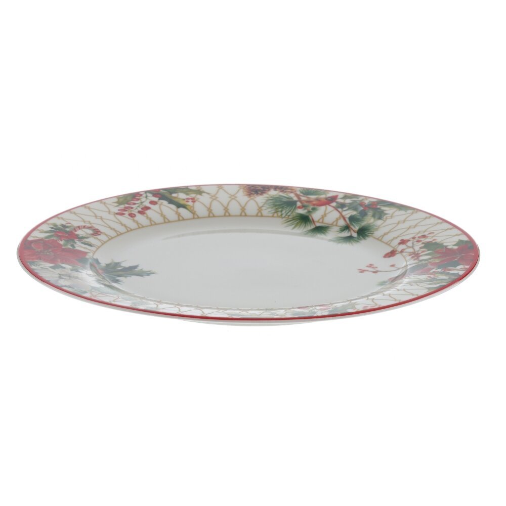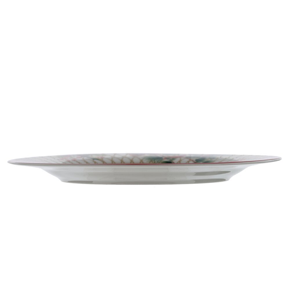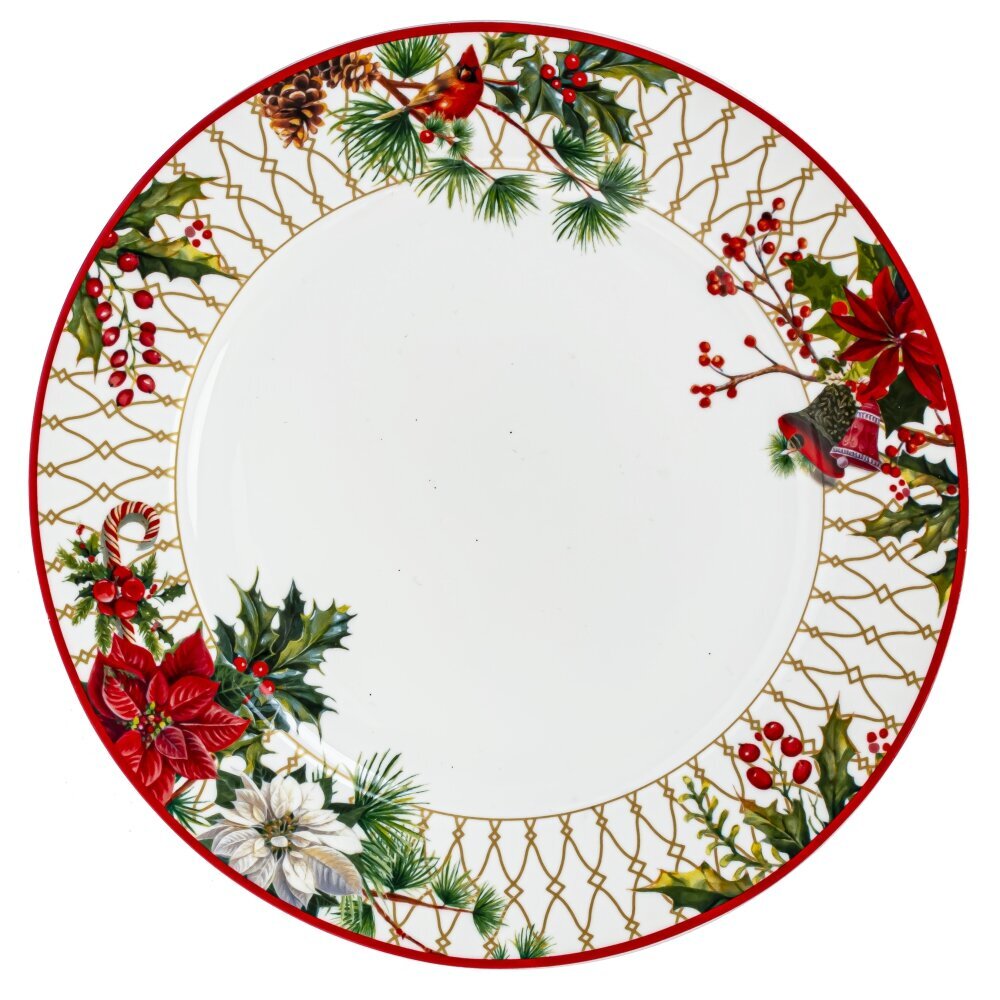 Круглая тарелка "Зимнее волшебство" диаметром 19 см из тонкостенного фарфора с красной каймой и золотым решетчатым узором. Новогодние ветви, яркие цветы пуансеттии, ягоды и птичка красный кардинал создают неповторимую атмосферу праздника. Уникальный дизайн делает эту тарелку идеальным предметом для сервировки стола и подарком для любителей красоты и изыска.