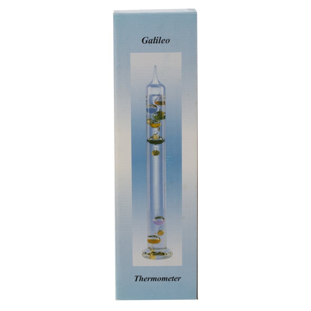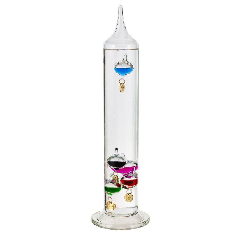 Элегантный термометр Галилея из прозрачного стекла — функциональный и декоративный предмет интерьера. Цилиндрическая колба с утолщённым основанием заполнена жидкостью, внутри плавно перемещаются разноцветные стеклянные капсулы с металлическими бирками?грузиками. Каждая капсула откалибрована по плотности, поэтому при нагреве или охлаждении одни всплывают, другие опускаются. Температуру считывают по самой нижней из плавающих в верхнем слое капсул. Типичный диапазон измерений — около 18–26 °C. Изделие герметично, выполнено из качественного стекла, гармонично смотрится в кабинете, гостиной или на рабочем столе, добавляя интерьеру научный акцент. Рекомендуется беречь от ударов и прямых солнечных лучей, протирать мягкой тканью.