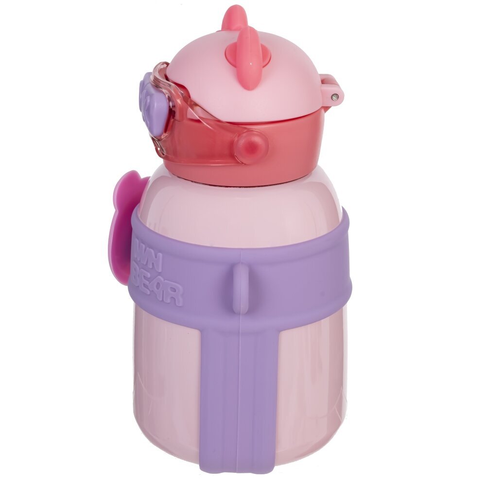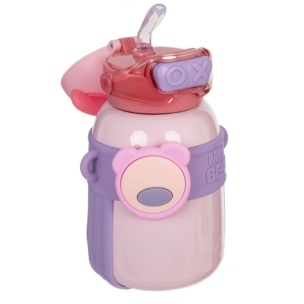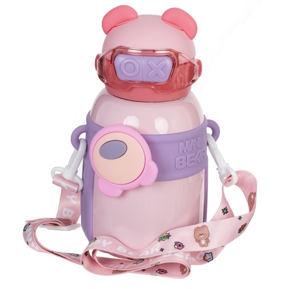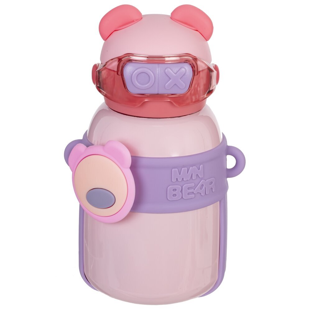 Оригинальная бутылка объемом 600 мл, выполненная из прочных полимерных материалов. Дизайн изделия яркий и привлекательный — бутылка имеет розовый цвет, украшена милыми ушками на крышке и декоративными элементами в виде очков, напоминающих мордочку медвежонка. На поверхности есть надпись "MY BEAR", а также специальная силиконовая вставка для удобства удержания в руке. В комплекте имеется удобный ремешок для переноски, также выполненный в детской тематике с принтами маленьких мишек и надписями. Такая бутылка отлично подойдет для детей: она легкая, безопасная, герметичная и стильная — идеальна для школы, прогулок или спортивных секций. Полимерные материалы обеспечивают долгий срок службы и простоту ухода.