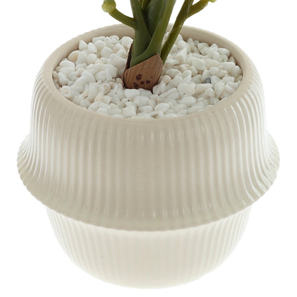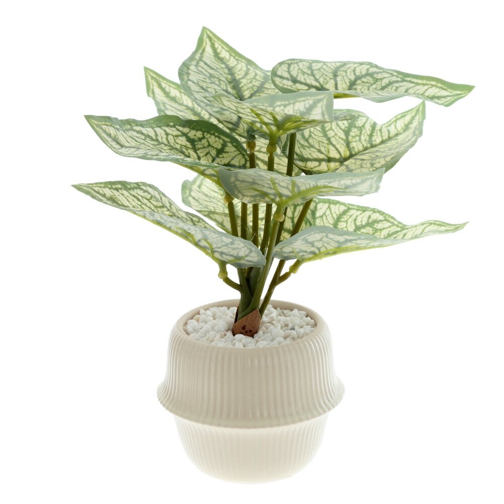 Цветочная композиция "Каладиум" — это изысканное украшение интерьера, которое привлекает внимание своими крупными декоративными листьями необычной формы и ярким контрастным рисунком прожилок. Листья каладиума имеют светло-зелёный оттенок с выразительными белыми прожилками, что делает растение визуально лёгким и воздушным. Композиция помещена в стильный керамический горшок кремового цвета с рельефной поверхностью, которая подчёркивает эстетическую привлекательность растения. В качестве декора верхний слой субстрата покрыт мелкой декоративной крошкой, что добавляет композиции аккуратности и завершённости. Такая композиция идеально подойдёт для украшения жилого или офисного пространства, создавая атмосферу уюта и свежести. Благодаря искусственному исполнению, этот каладиум не требует ухода, не выцветает и всегда сохраняет безупречный внешний вид, радуя своим ярким обликом каждый день.