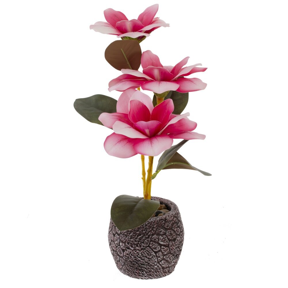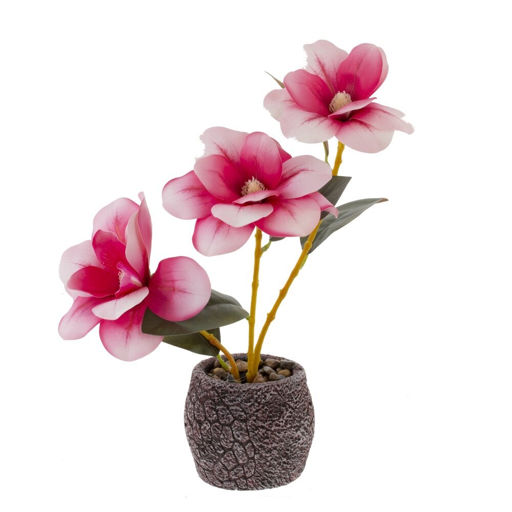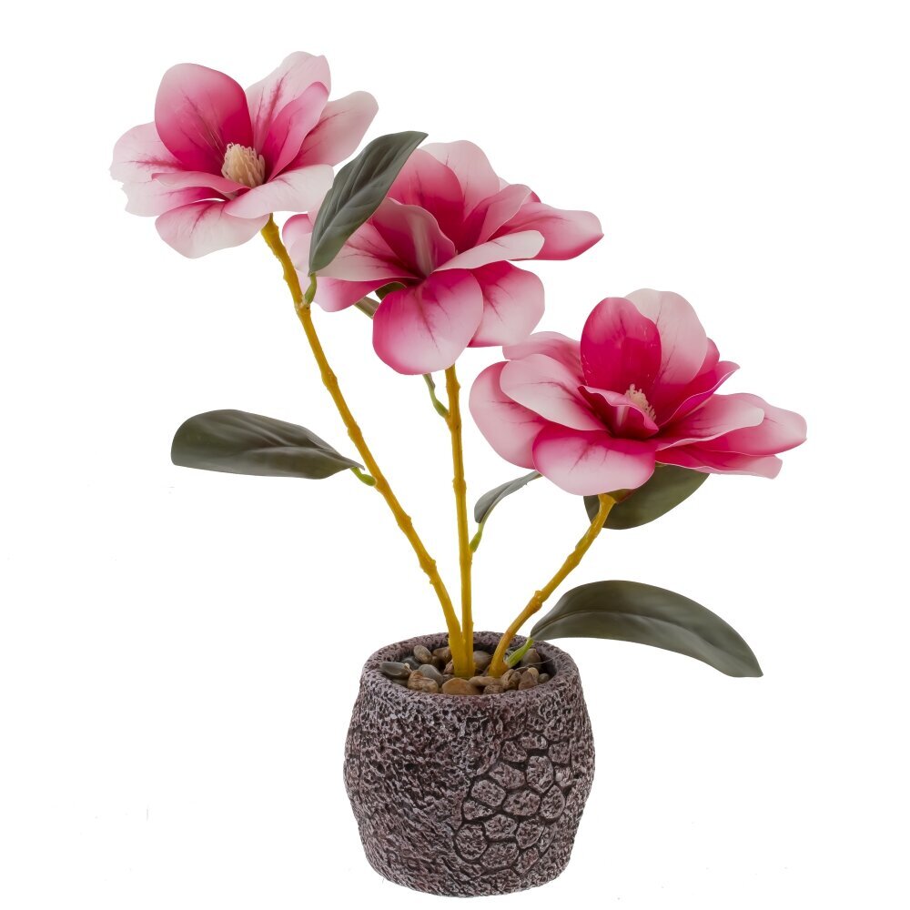Цветочная искусственная композиция «Магнолия» — утончённый акцент для любого интерьера. В компактном серо-каменистом кашпо с декоративной галькой расположены три изящные ветви с крупными бутонами. Лепестки переходят от насыщенно-розового к мягкому белому по краям, создавая эффект живого цветка. Плотные зелёные листья и аккуратные стебли подчёркивают реалистичность. Композиция не требует ухода: не вянет, не нуждается в поливе и солнечном свете, сохраняет форму и цвет круглый год. Идеально для гостиной, спальни, офиса или приёмной, красиво смотрится на подоконнике, полке или кофейном столике. Прекрасная идея подарка для ценителей элегантной, спокойной эстетики.