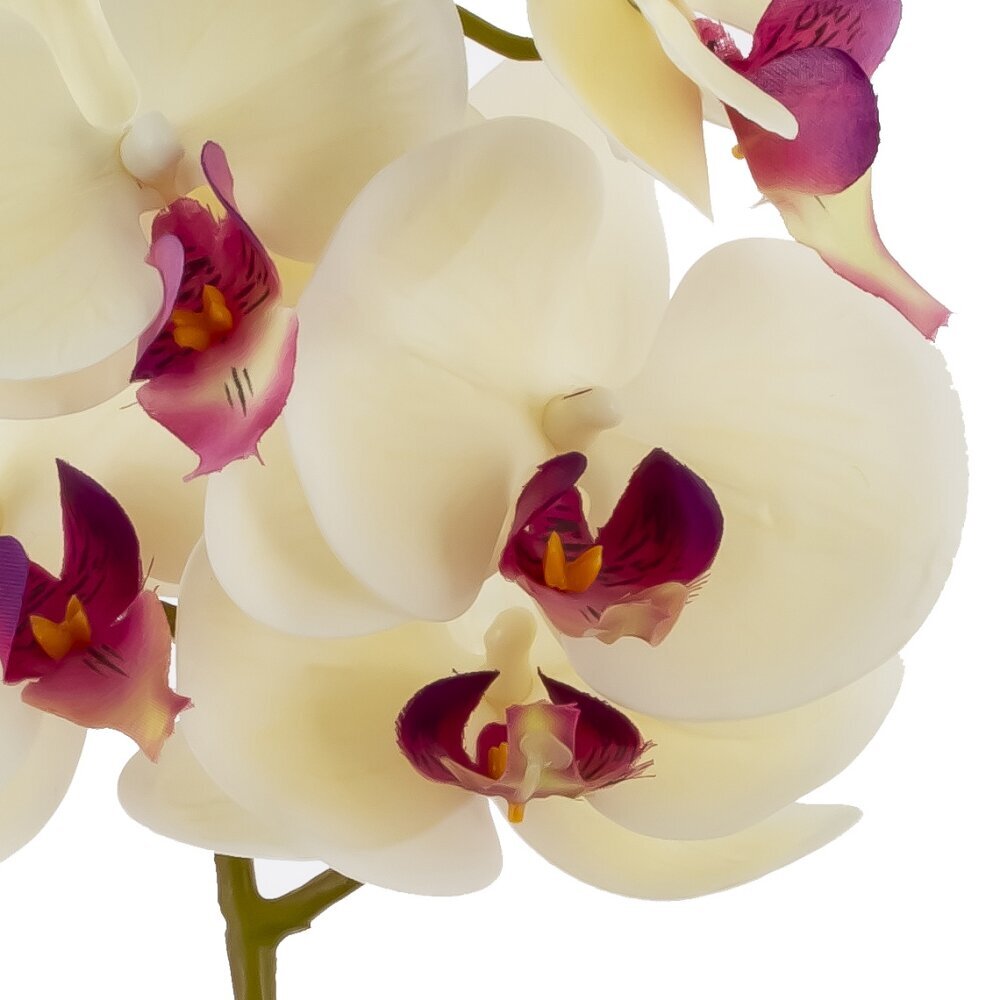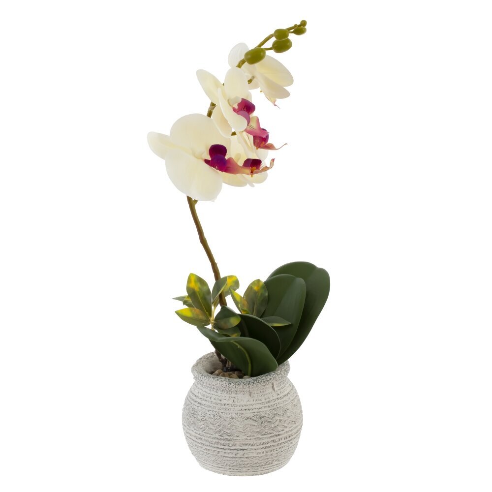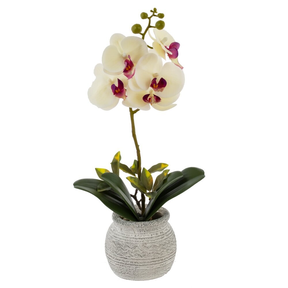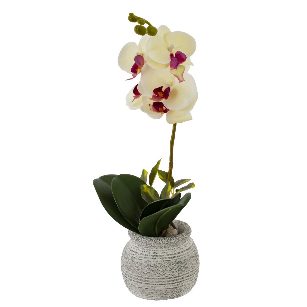 Искусственная цветочная композиция «Орхидея» — изящный акцент для любого интерьера. На тонком стебле распускаются крупные кремово-белые соцветия с насыщенно-бордовым центром и деликатными жёлтыми пыльниками, а верхние бутончики добавляют ощущение естественного роста. У основания — плотные глянцевые листья глубокого зелёного оттенка, создающие гармоничный объём. Растение оформлено в компактном серо-белом горшке с выразительным рельефом, подчёркивающим утончённый характер композиции. Не требует полива и особого ухода, долго сохраняет форму и цвет. Идеальна для дома и офиса, подходит к современным и классическим стилям, привнося ощущение свежести, чистоты и спокойствия.