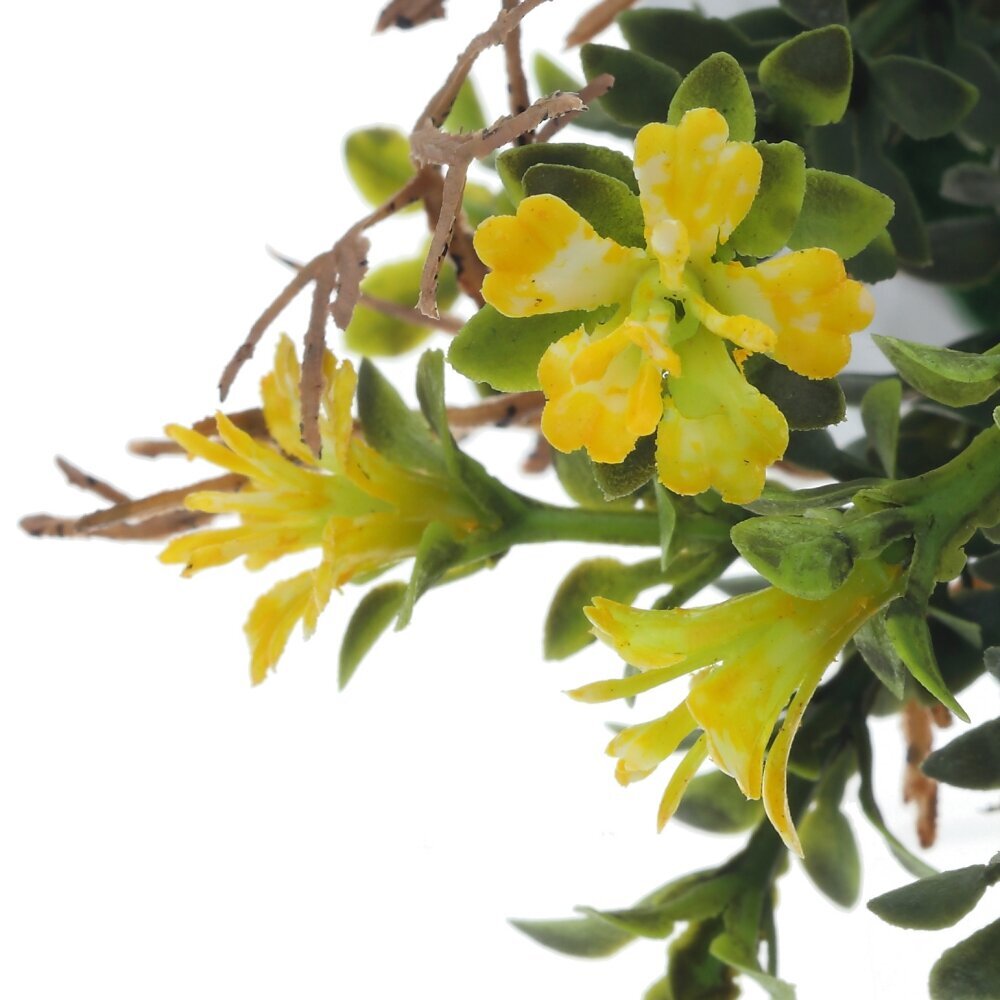 Искусственная цветочная композиция, выполненная в небольшом декоративном горшке коричневого цвета. Композиция состоит из сочетания ярко-зелёных листьев и ветвей, а также искусственных цветов с жёлтыми лепестками. Среди зелёных веточек присутствуют элементы, имитирующие засохшие ветви, что придаёт этой композиции необычный и слегка винтажный вид. Благодаря сочетанию живых оттенков зелени и оригинальных цветов, такая композиция способна украсить любой интерьер, внести в помещение ноту уюта и весеннего настроения. Искусственные растения не требуют ухода, не боятся отсутствия света и воды, поэтому отлично подойдут для офисов, квартир или помещений, где невозможно разместить настоящие цветы.