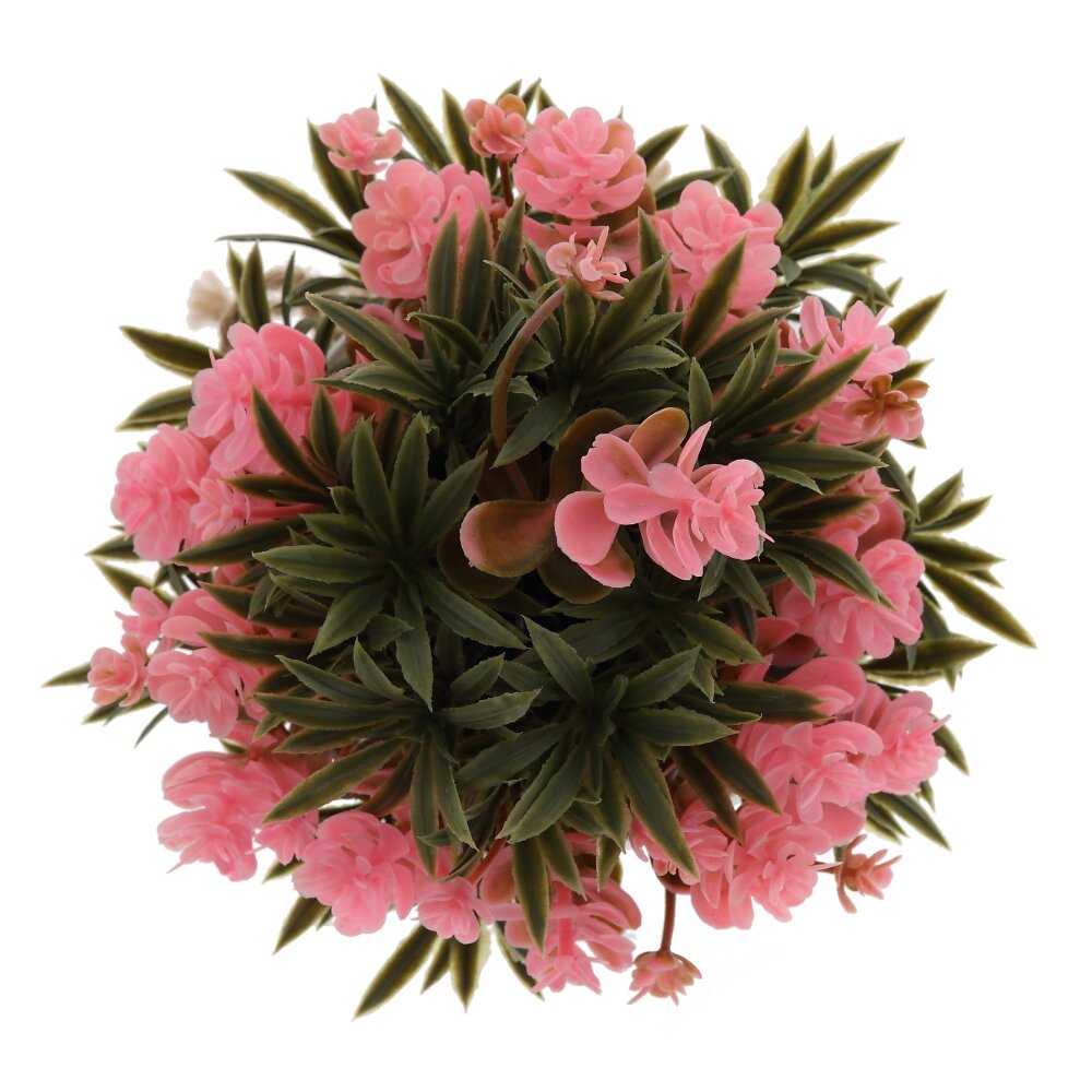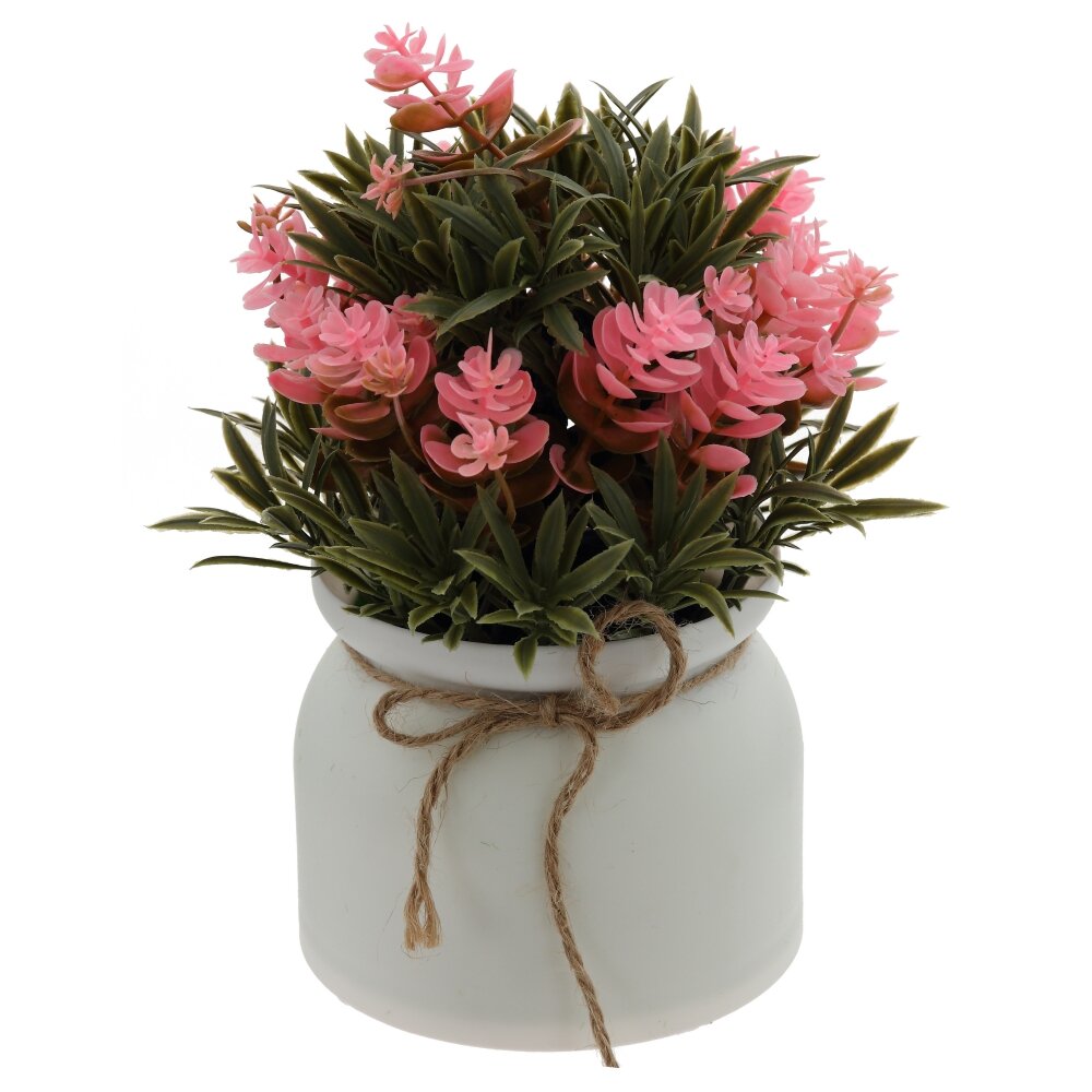 Искусственная цветочная композиция – стильный акцент для любого интерьера, который не требует ухода. Нежно?розовые соцветия гармонично сочетаются с насыщенной зеленью листвы, создавая эффект живого растения. Композиция размещена в лаконичном белом горшке, украшенном декоративным джутовым шнуром, что придаёт оформлению лёгкий оттенок эко-стиля и уюта. Такой декор идеально подойдёт для гостиной, спальни, кухни, офиса или приёмной. Растение не выцветает, не осыпается и сохраняет аккуратный вид круглый год. Композицию можно использовать как самостоятельный акцент на подоконнике, полке, рабочем столе или в составе декоративных композиций. Отличный вариант подарка тем, кто ценит красоту цветов, но не имеет времени ухаживать за живыми растениями.