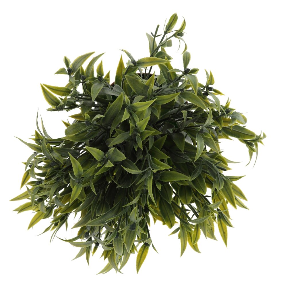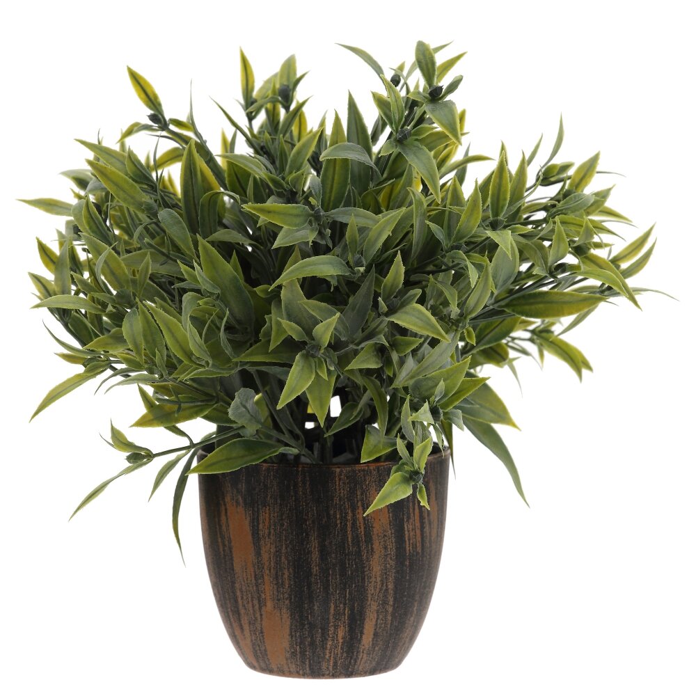 Стильная цветочная искусственная композиция в декоративном кашпо станет ярким акцентом в любом интерьере. Пышная зелёная листва с естественным оттенком и разной формой листьев реалистично имитирует живое растение, придавая помещению свежесть и уют круглый год. Горшок выполнен в коричнево?черной гамме с эффектом деревянной текстуры, что гармонично сочетается как с современным, так и с классическим стилем оформления. Композиция не требует полива, освещения и особого ухода, не выгорает и долго сохраняет первоначальный вид. Идеально подходит для офиса, гостиной, кухни, приемной, витрины магазина или в подарок тем, кто ценит красоту без лишних хлопот.