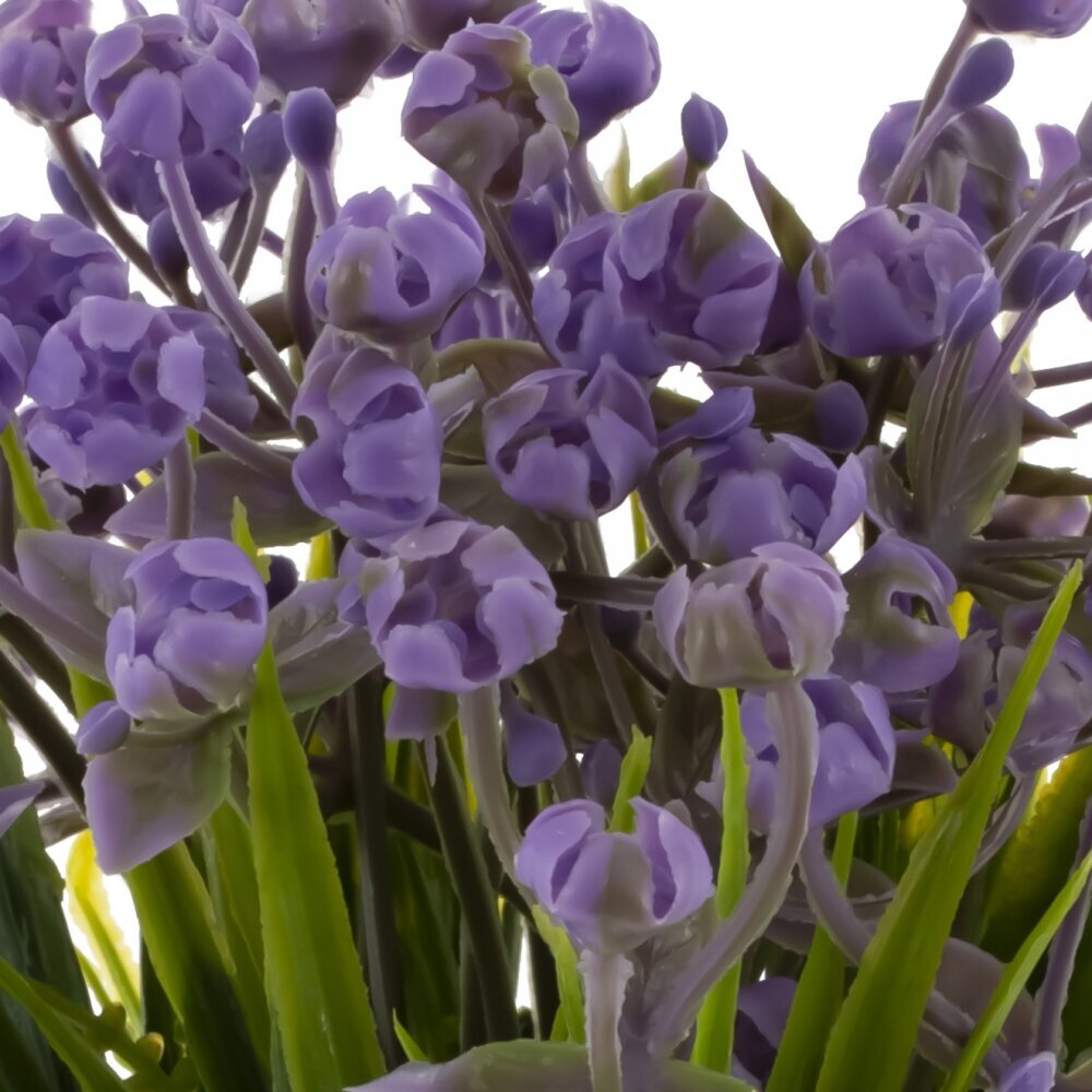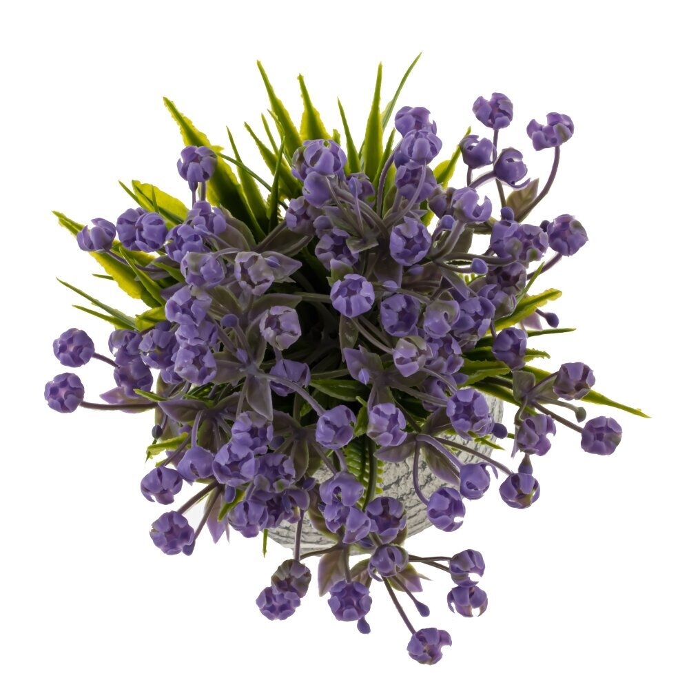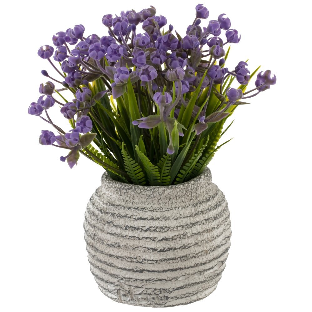 Небольшая искусственная композиция в декоративном горшке привносит в интерьер спокойствие и свежесть без хлопот по уходу. Пышные зеленые листья разной формы — от узких травянистых до мелких «папоротниковых» — образуют густую основу, из которой поднимаются тонкие стебли с множеством сиренево?лиловых бутонов. Соцветия напоминают полевые цветы, выглядят аккуратно и естественно благодаря мягким оттенкам и матовой фактуре пластика. Горшок округлой формы с выраженной рельефной полосатой текстурой выполнен под камень или керамику и добавляет композиции тактильности. Такой декор гармонично впишется в гостиную, спальню, ванную или рабочее место, не выцветает и не требует полива — достаточно периодически протирать пыль. Идеален для подарка или как спокойный акцент на полке, подоконнике или журнальном столике.