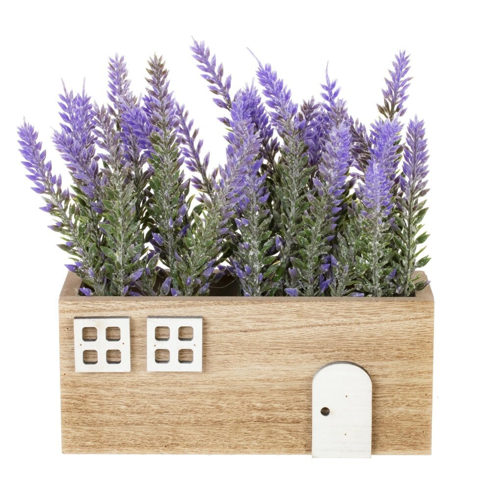 Цветочная композиция "Лаванда" станет прекрасным украшением для любого интерьера. Композиция выполнена из качественных полимерных материалов, что придает ей реалистичный и ухоженный вид. Яркие фиолетовые соцветия лавандового куста гармонично сочетаются с зелёной листвой, создавая ощущение природной свежести и уюта. Композиция размещена в оригинальном деревянном кашпо, оформленном в виде домика с маленькими окошками и дверцей, что добавляет изделию особый шарм и декоративную ценность. Размер изделия позволяет разместить композицию на столе, полке или подоконнике, не перегружая пространство. Этот аксессуар не требует ухода, всегда сохраняет свой привлекательный вид, не выцветает и не осыпается. Композиция "Лаванда" идеально подойдет для подарка и стильного декора вашего дома или офиса.