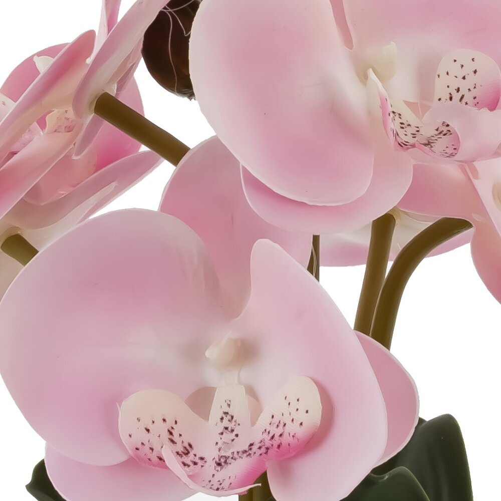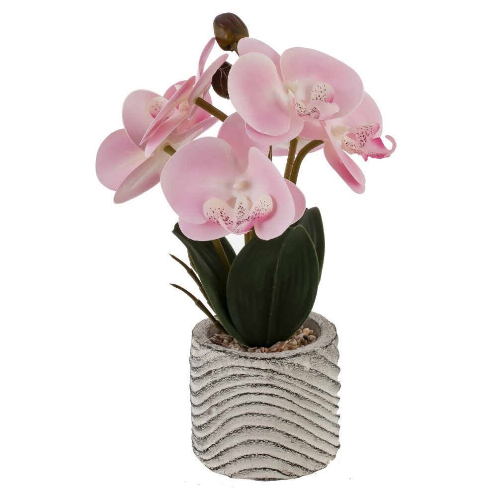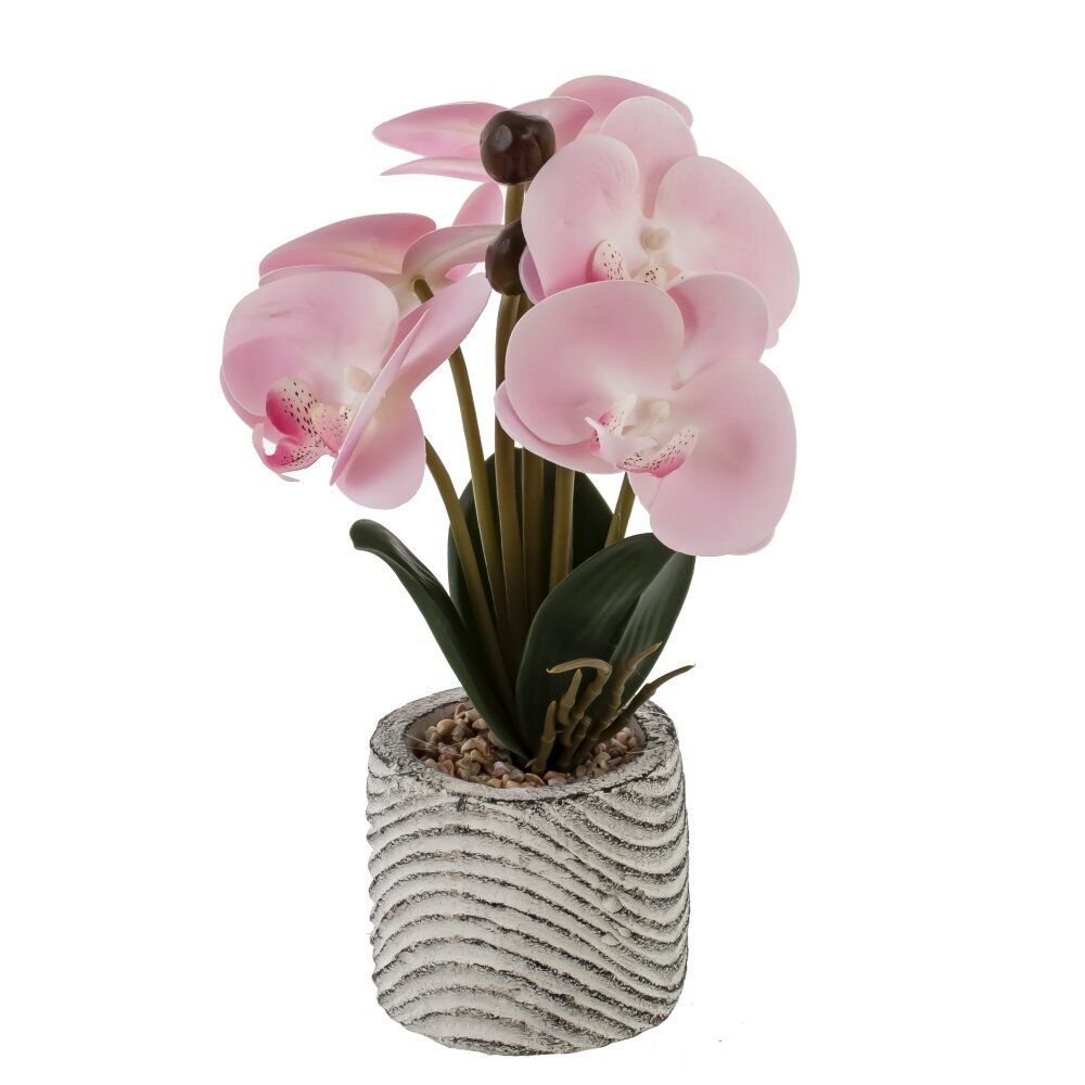 Искусственная цветочная композиция «Орхидея» — элегантный акцент для любого интерьера. Нежно?розовые соцветия с плавными переходами оттенков и аккуратными крапинками в сердцевине выглядят максимально реалистично, дополнены плотными глянцевыми листьями и закрытыми бутонами на изящных стеблях. Цветок закреплен в декоративном горшке светлого тона с выразительным рельефом «волны», сверху композиция оформлена мелкой галькой, что придает ей натуральный вид и устойчивость. Такое украшение не требует полива, пересадки и особого ухода — достаточно периодически протирать от пыли. Компактный размер позволяет легко разместить его на подоконнике, полке, журнальном столике или рабочем месте. «Орхидея» уместна в гостиной, спальне, ванной, офисе или зоне ресепшен, а также станет приятным, долговечным подарком тем, кто ценит красоту живых цветов без хлопот и ограничений по освещению.
