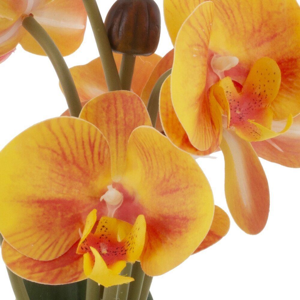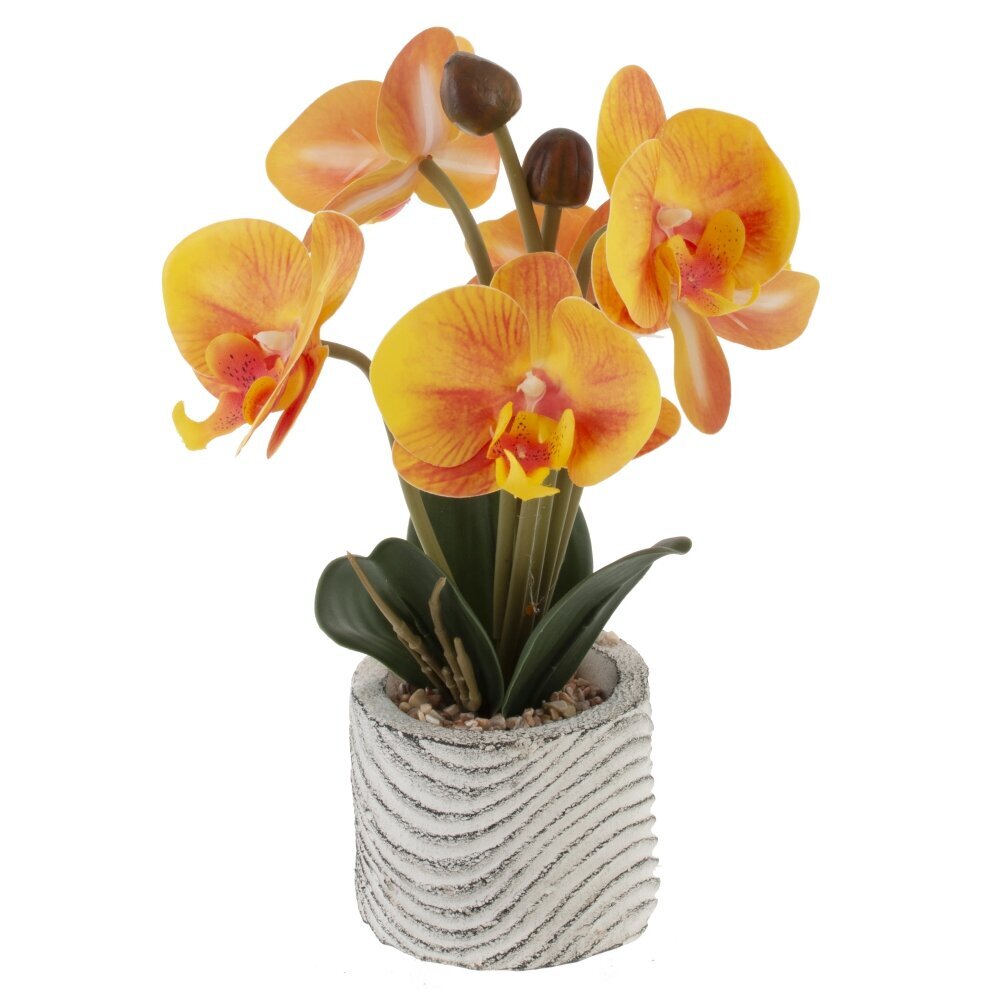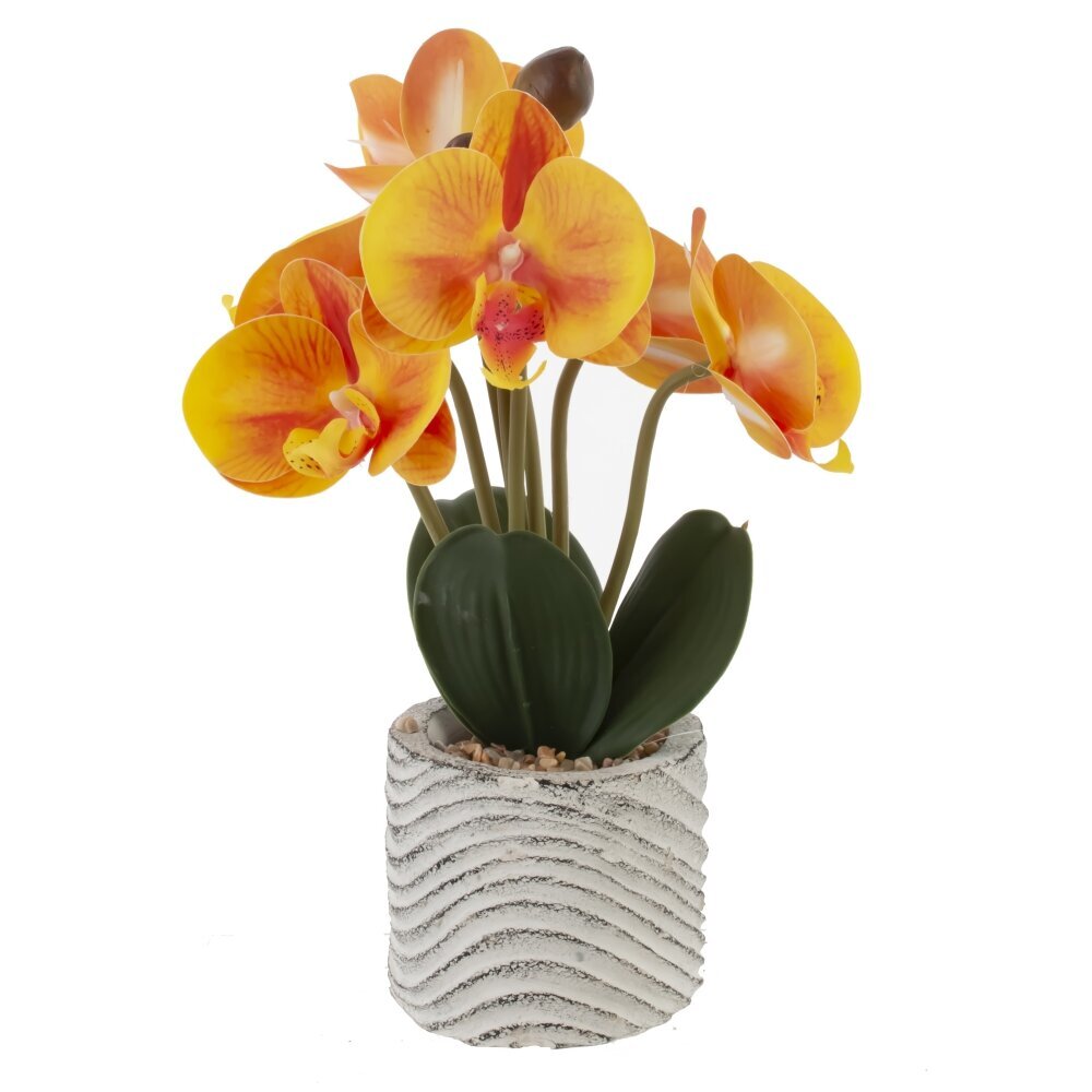 Искусственная цветочная композиция «Орхидея» — элегантный акцент для любого интерьера. Нежно- оранжевые соцветия с плавными переходами оттенков и аккуратными крапинками в сердцевине выглядят максимально реалистично, дополнены плотными глянцевыми листьями и закрытыми бутонами на изящных стеблях. Цветок закреплен в декоративном горшке светлого тона с выразительным рельефом «волны», сверху композиция оформлена мелкой галькой, что придает ей натуральный вид и устойчивость. Такое украшение не требует полива, пересадки и особого ухода — достаточно периодически протирать от пыли. Компактный размер позволяет легко разместить его на подоконнике, полке, журнальном столике или рабочем месте. «Орхидея» уместна в гостиной, спальне, ванной, офисе или зоне ресепшен, а также станет приятным, долговечным подарком тем, кто ценит красоту живых цветов без хлопот и ограничений по освещению.
