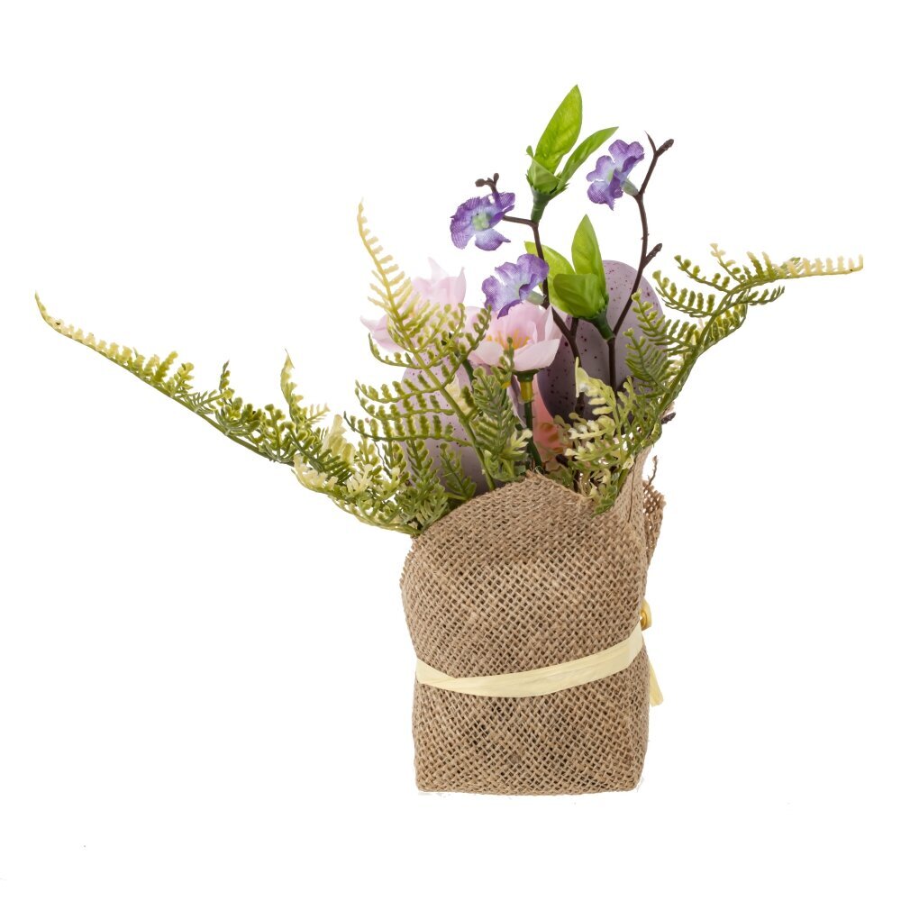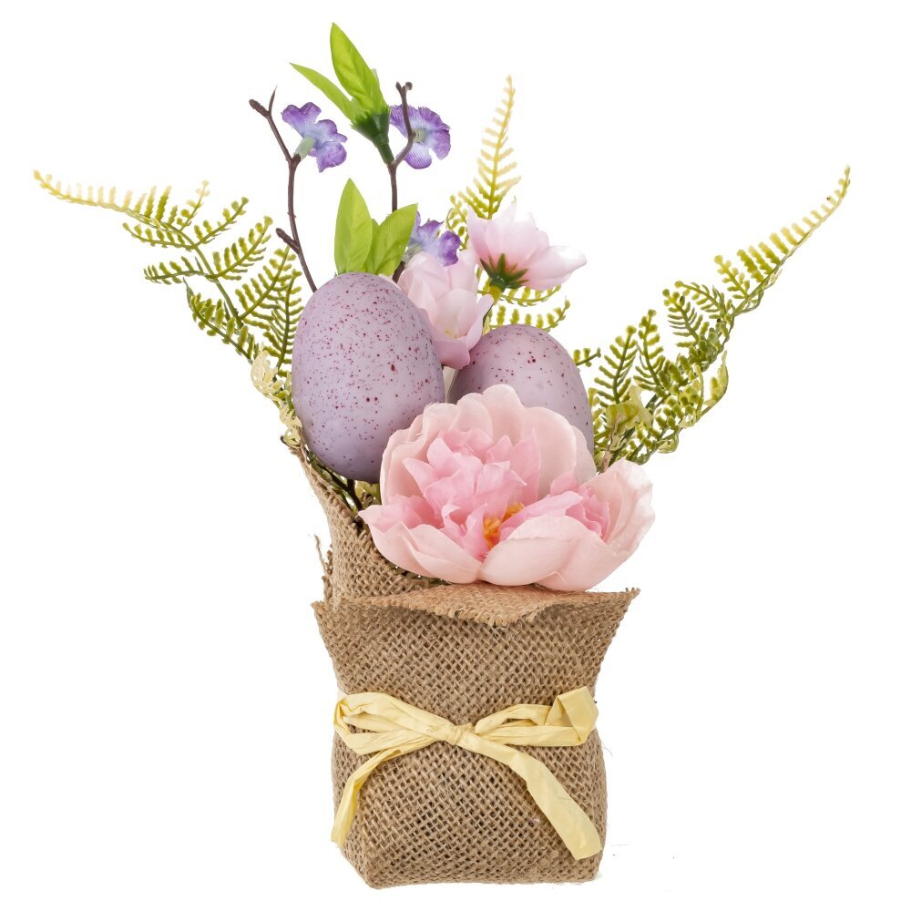 Эта изысканная пасхальная цветочная композиция выполнена из полимерных и текстильных материалов, гармонично соединяя искусственные цветы, декоративные яйца и зелень. Нежные розовые пионы и миниатюрные сиреневые цветки из текстиля создают атмосферу весенней свежести. Листья папоротника и другие декоративные элементы придают композиции естественный и праздничный вид. Центральными элементами стали искусственные яйца с эффектом крапинок, которые символизируют Пасху. Основа украшения представляет собой кашпо из мешковины, перевязанный декоративной лентой, что придаёт ему уютный стиль. Такая композиция станет прекрасным украшением для дома или оригинальным подарком на Пасху.