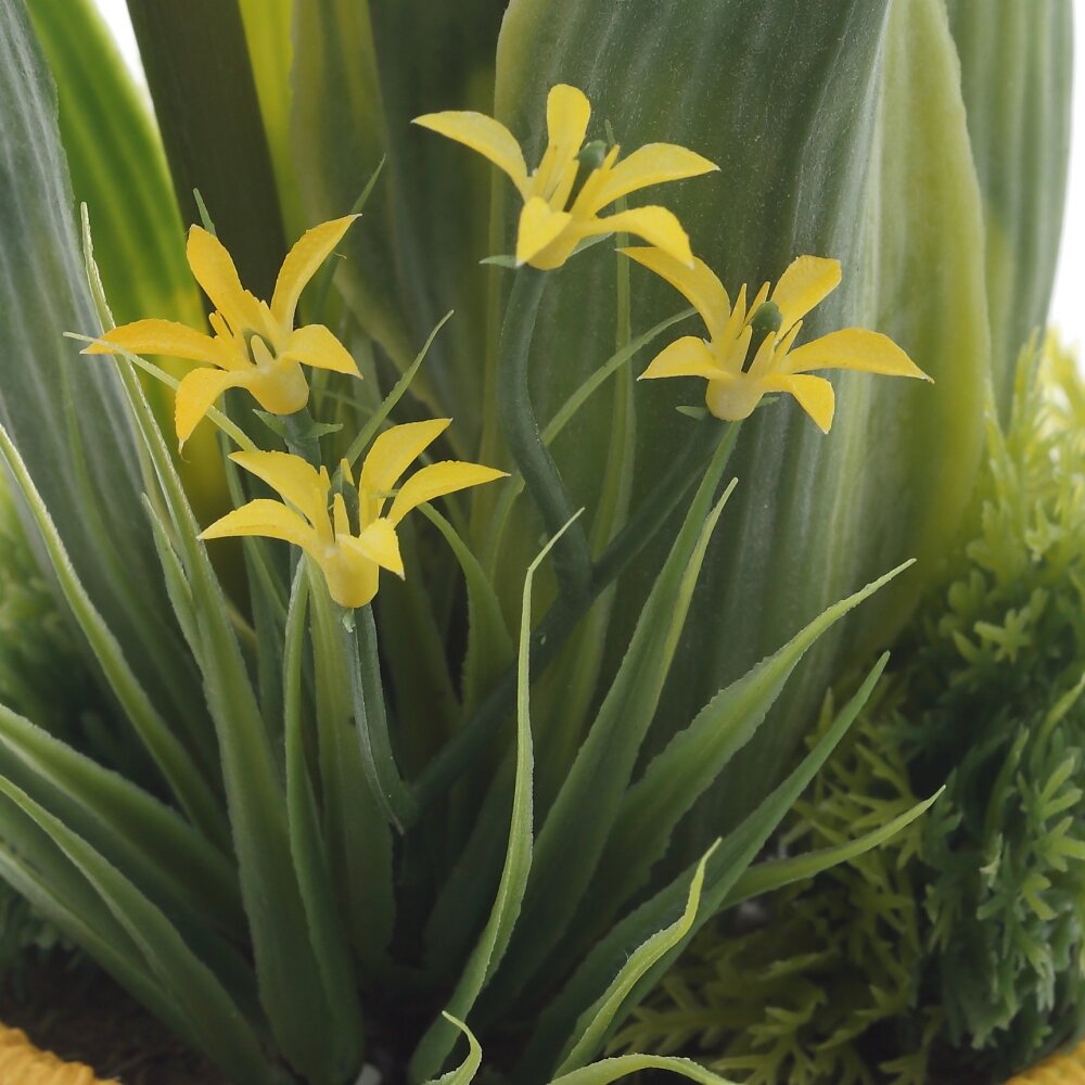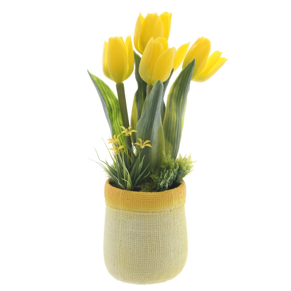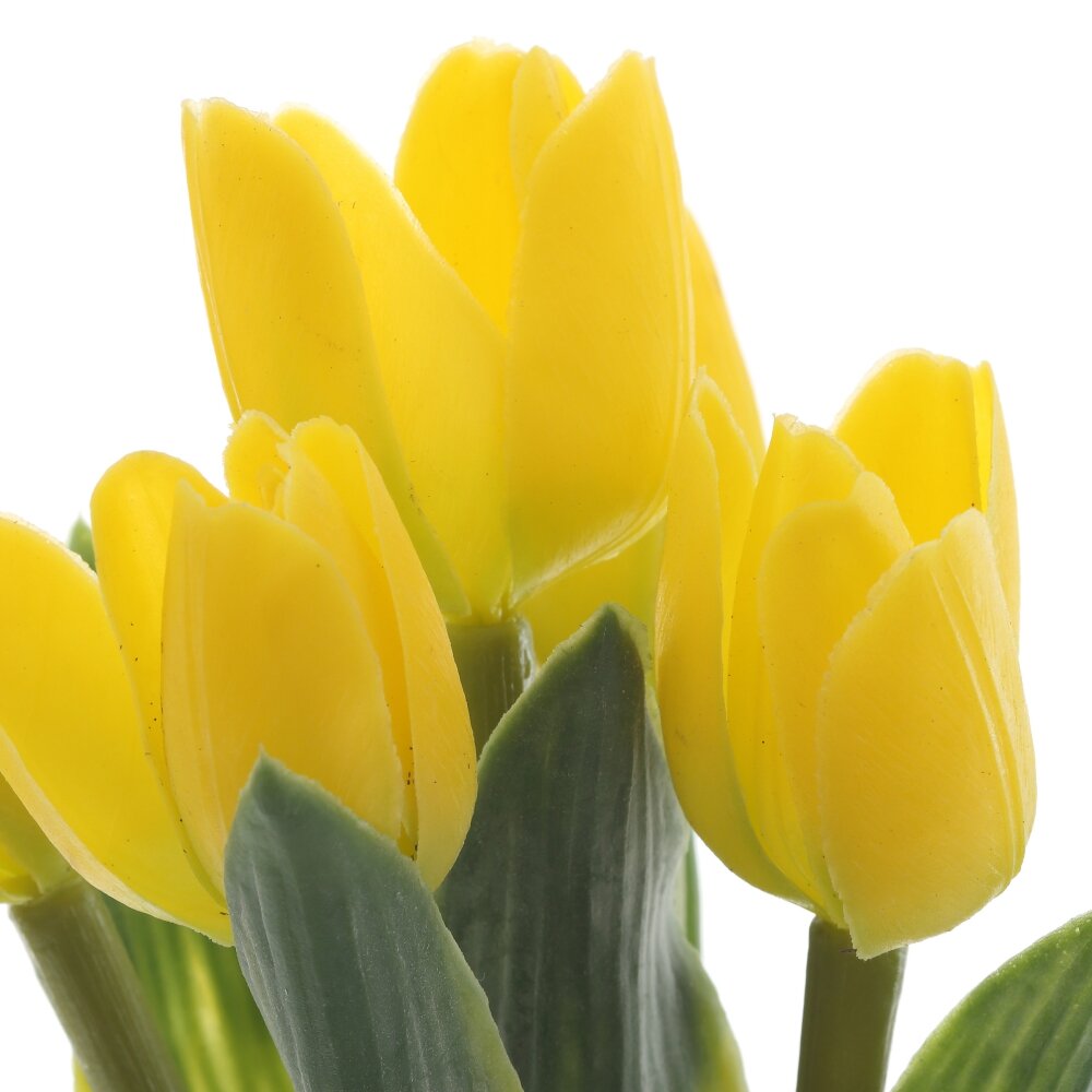 Цветочная композиция «Тюльпаны» — яркий акцент для любого интерьера. Пышные жёлтые бутоны и плотные зелёные листья выполнены из качественных полимерных материалов с реалистичной фактурой лепестков и прожилок. Стебли имеют прочный металлический каркас, благодаря чему форма цветов сохраняется, а композиция устойчиво стоит в кашпо. У основания добавлена декоративная зелень: травы, миниатюрные цветочки и мох, создающие эффект живой клумбы. Кашпо пастельно?жёлтого оттенка подчёркивает солнечную палитру букета. Композиция не требует ухода, не выцветает и подходит для дома, офиса или в качестве подарка, наполняя пространство ощущением свежести и тепла круглый год.