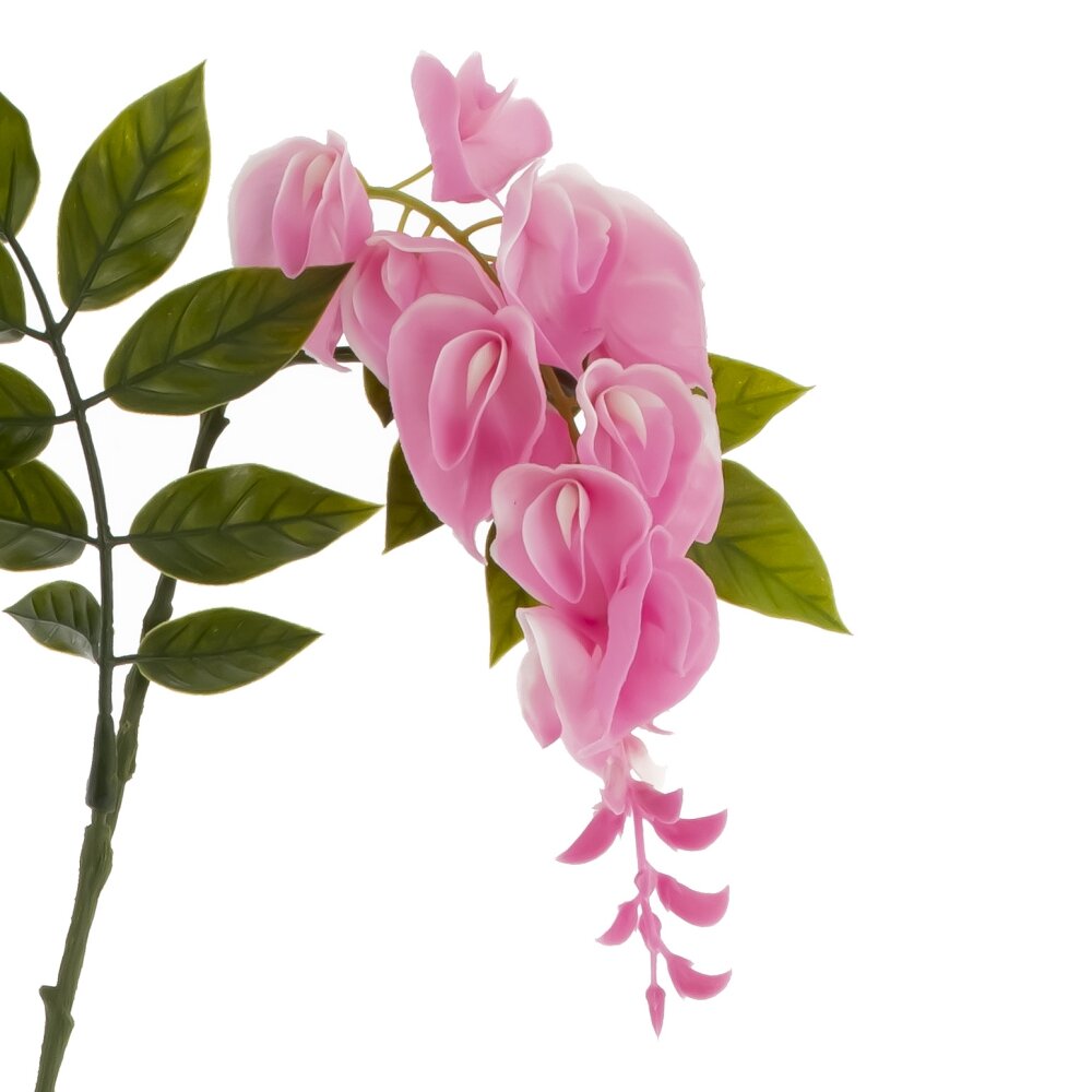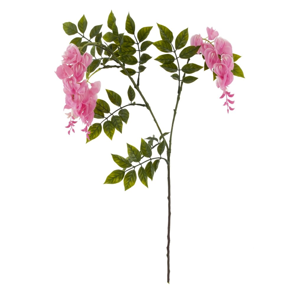 Искусственная глициния — изящная ветвь с несколькими ниспадающими кистями нежно?розовых цветков и насыщенно?зелёной листвой. Лепестки выполнены из качественных полимерных материалов, сохраняют форму и цвет, не требуют полива и особого ухода. Стебли усилены металлической основой, поэтому ветка легко принимает нужное положение и надежно удерживает форму в композициях. Подходит для интерьера, витрин, фотозон и праздничного оформления. Для ухода достаточно периодически протирать пыль сухой салфеткой.