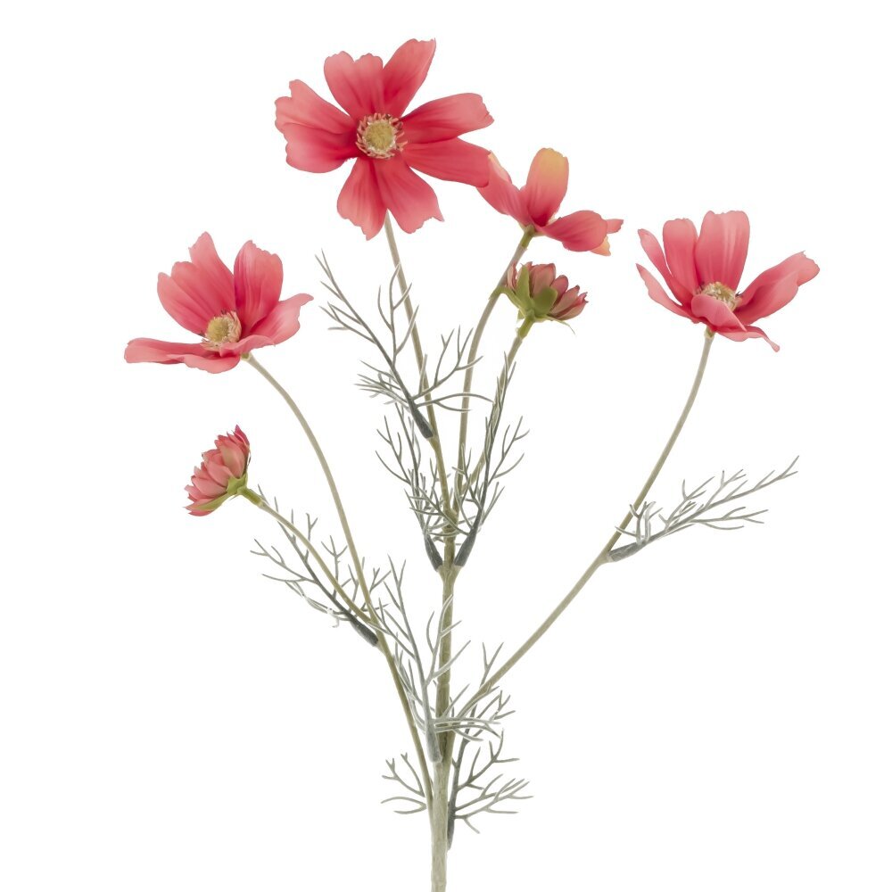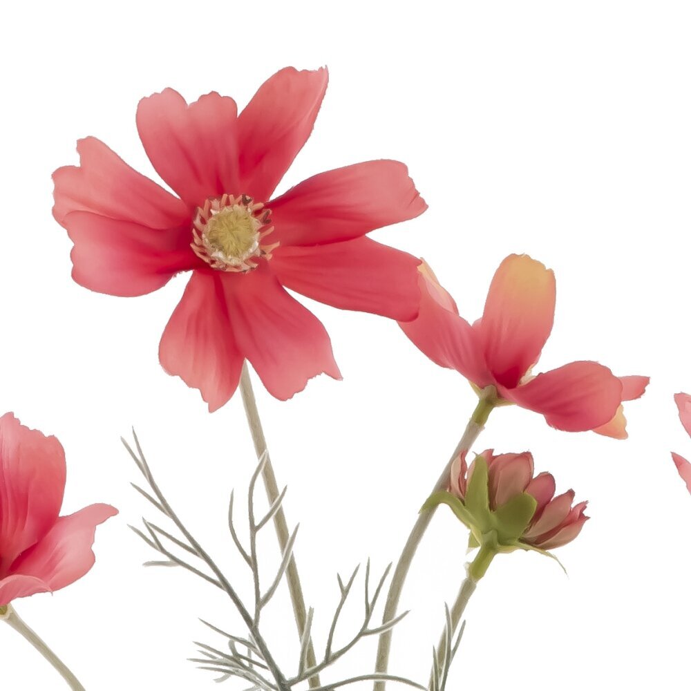 Искусственная Космея — изящная ветка с несколькими раскрытыми цветками и бутонами на длинном стройном стебле. Ярко-розовые лепестки раскрываются вокруг тёплой жёлтой серединки, а тонкая, ажурная зелень напоминает перистую листву живого растения. Ветка хорошо держит форму, оставаясь пластичной — удобно подрезать, сгибать и вписывать в композиции. Не выцветает, не требует полива и особого ухода, устойчива к перепадам температуры. Гармонично смотрится в одиночной вазе, полевых букетах, венках и настенных панно, подойдёт для декора дома, витрин, фотозон и праздничных событий. Создаёт лёгкое летнее настроение круглый год и помогает добавить интерьеру нежности и воздушности.