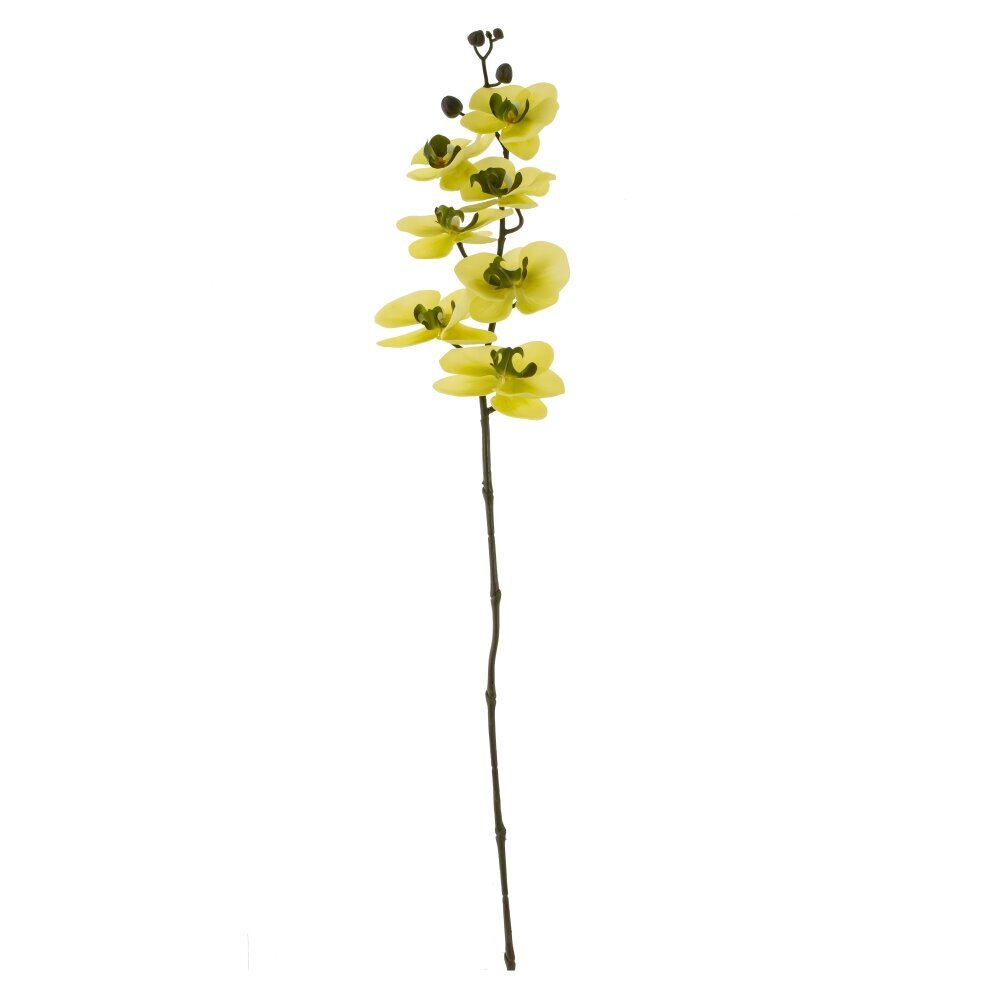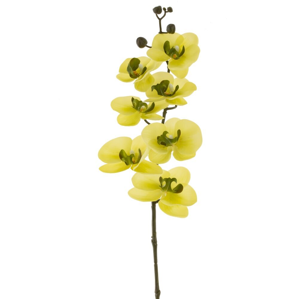 Искусственный цветок «Орхидея» в технологии Real Touch — изящная ветка с длинным стройным стеблем, на котором расположены несколько раскрытых цветков и бутоны. Лепестки лимонно?желтого оттенка с выразительной сердцевиной выглядят и ощущаются как живые: гладкие, упругие, с деликатным матовым блеском. Гибкий стебель позволяет легко придавать нужный изгиб и формировать композиции. Такая орхидея не требует полива и особого ухода, долго сохраняет форму и цвет, гипоаллергенна и подходит для дома, офиса, витрин, фотозон и свадебного декора. Идеальна как соло в высокой вазе или в составе букетов.