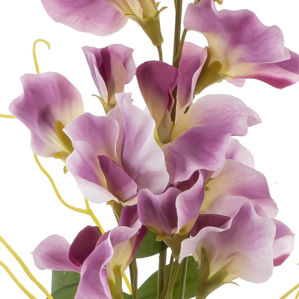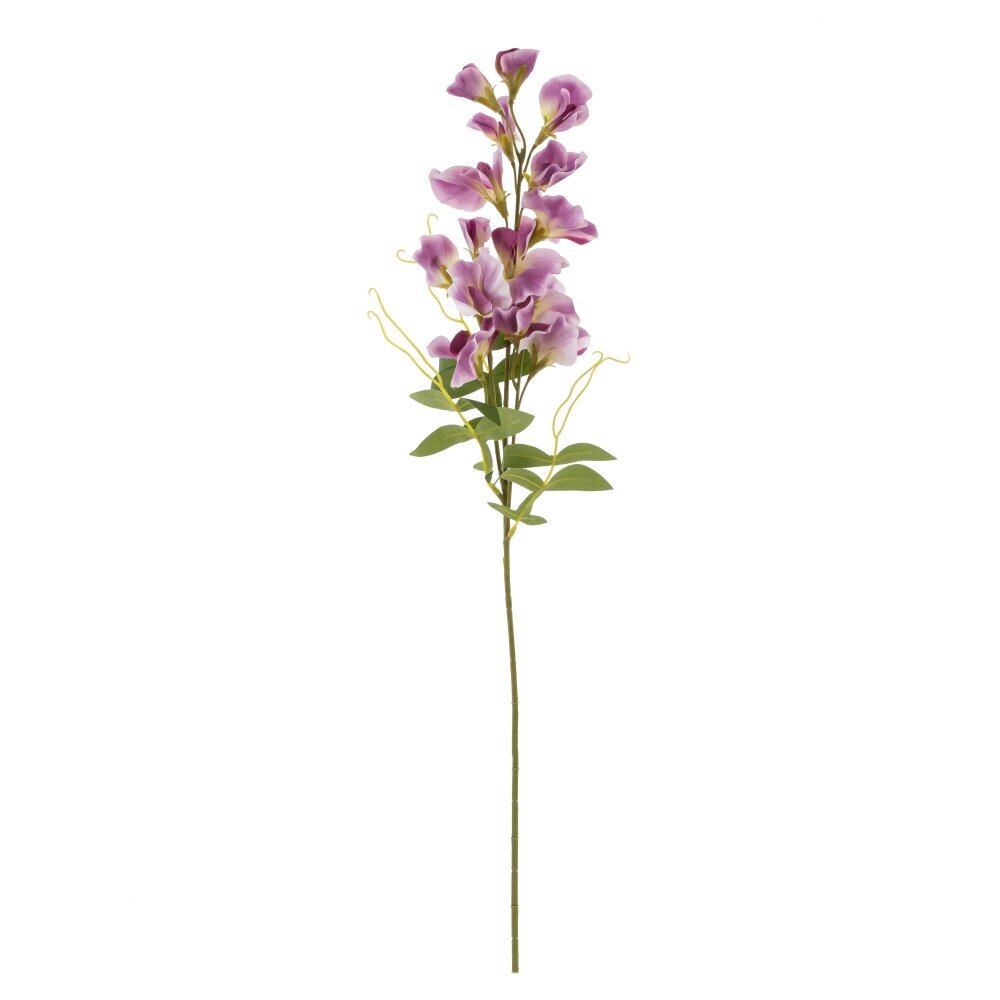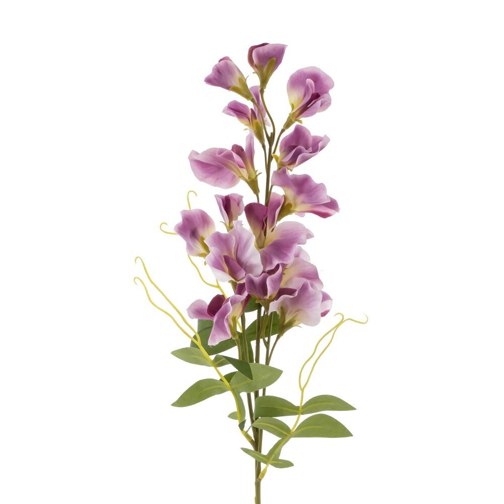 Искусственный цветок «Душистый горошек» — изящный декоративный стебель с волнистыми шелковистыми лепестками нежно?розово?сиреневого оттенка и мягким переходом к молочно?белому центру. Тонкие усики и матовые зеленые листочки придают веточке естественный, «живой» вид. Длинный стебель с гибким сердечником легко подрезать и придавать форму для букетов, венков и интерьерных композиций. Цветок не требует полива, сохраняет форму и цвет при бережном обращении, достаточно периодически смахивать пыль. Подходит для украшения дома, витрин, фотозон и праздничного декора, красиво смотрится как соло, так и в сочетании с полевыми травами и другими цветами, придавая композициям легкость и романтичность круглый год.