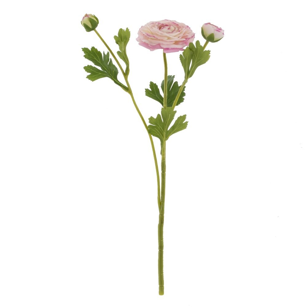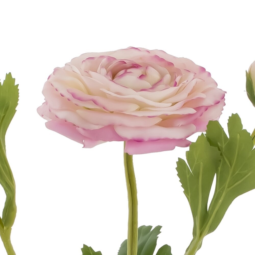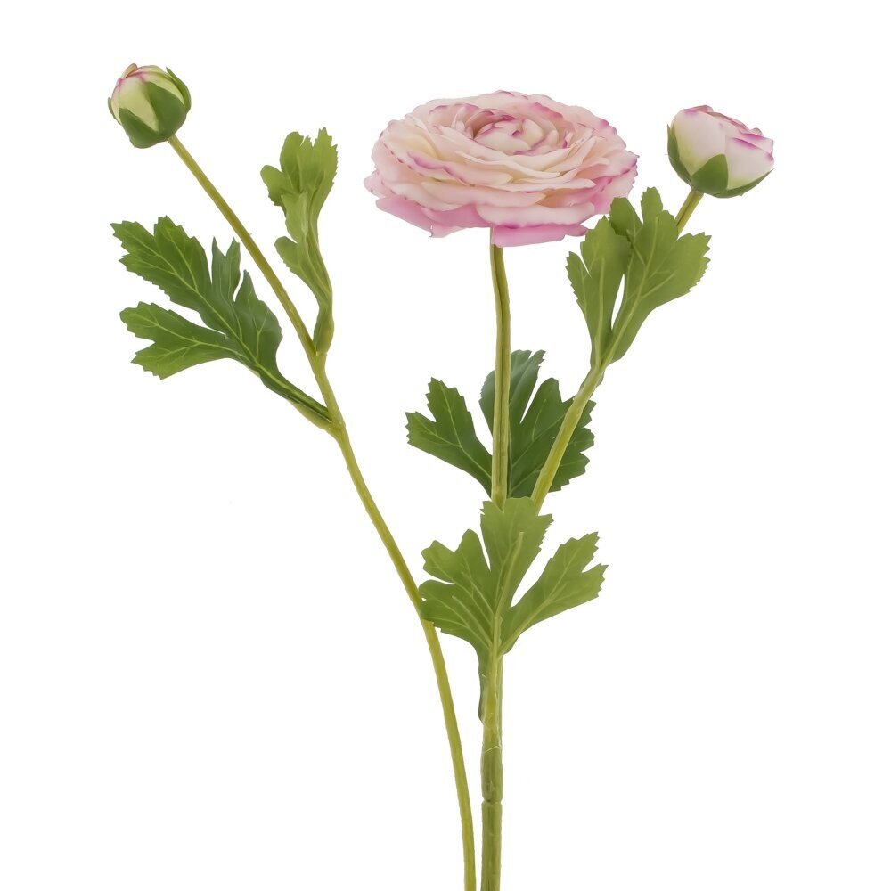 Искусственный цветок «Ранункулюс», выполненный по технологии изготовления Real Touch. На одном изящном стебле — пышный раскрытый цветок и два аккуратных бутона. Многослойные лепестки кремово?белого оттенка с нежной розовой каймой выглядят и ощущаются как живые: матово?шелковистая поверхность, приятная упругость, естественный изгиб. Резные зелёные листья и гибкий стебель добавляют реалистичности и позволяют легко формировать композиции. Ранункулюс не требует ухода, не выгорает и не осыпается. Идеален для букетов, свадебного и домашнего декора, витрин и фотосъёмок, прекрасно сочетается с розами, эвкалиптом и полевыми травами.