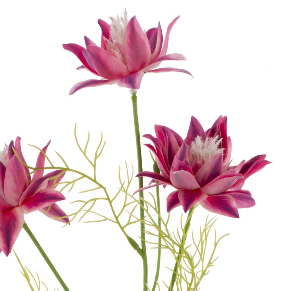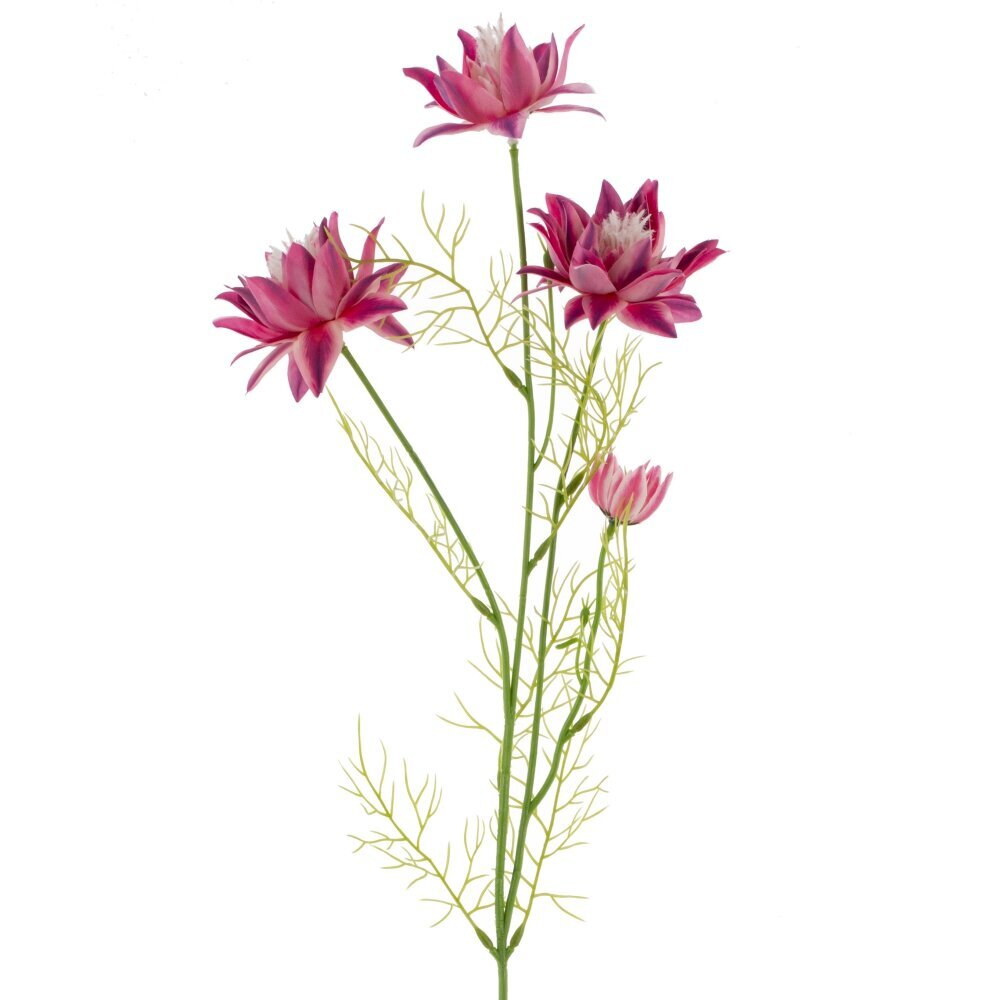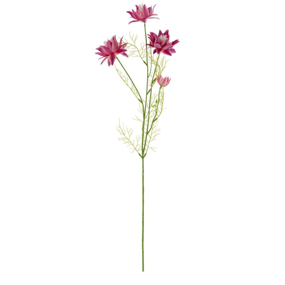 Изысканный искусственный цветок на длинном стройном стебле с несколькими ответвлениями. На верхушках расположены три полностью распустившиеся розово-малиновые цветка с плавным градиентом оттенков и светлыми, почти кремовыми серединками, а ниже – аккуратный бутон. Узкие рассечённые листья нежного салатового цвета создают воздушный, ажурный контур и добавляют композиции естественности. Стебель выглядит реалистично и позволяет легко формировать нужный изгиб в букете или вазы. Такой декоративный элемент подойдёт для оформления интерьера, витрин и фотозон, его удобно комбинировать с полевыми травами и нейтральной зеленью. Не требует ухода, сохраняет аккуратный вид в любое время года и гармонично вписывается как в минималистичные, так и в романтичные композиции.