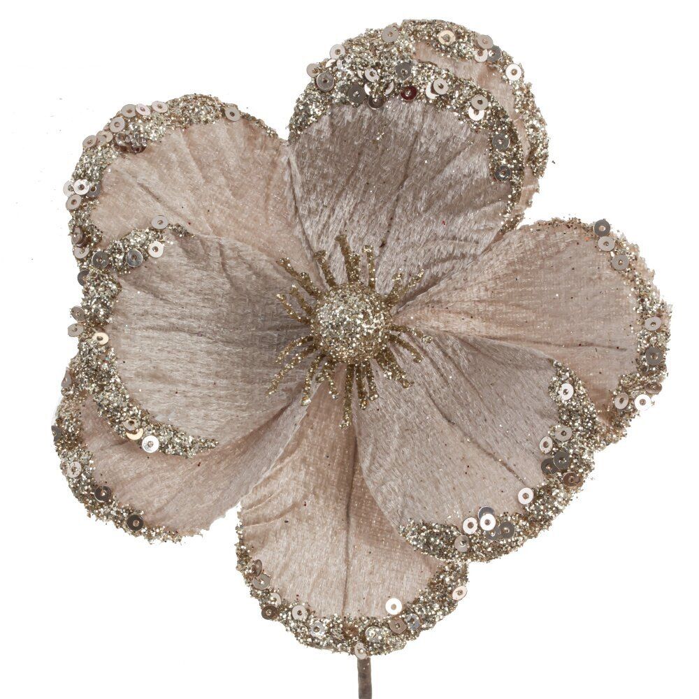 Прекрасный цветок из бархатистой ткани - это великолепное украшение для новогодней ели. Цветок украшен глиттером и пайетками, которые придают ему искрящийся блеск, дополняя праздничную атмосферу.