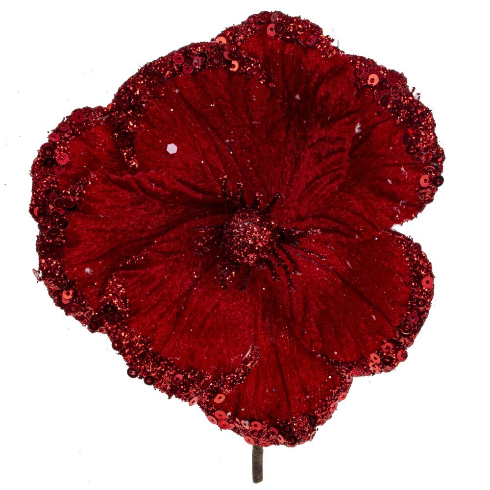 Прекрасный цветок из бархатистой ткани - это великолепное украшение для новогодней ели. Цветок украшен глиттером и пайетками, которые придают ему искрящийся блеск, дополняя праздничную атмосферу.