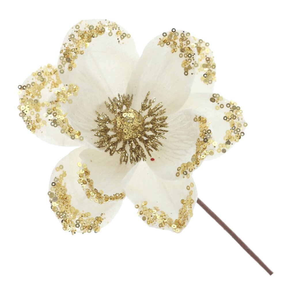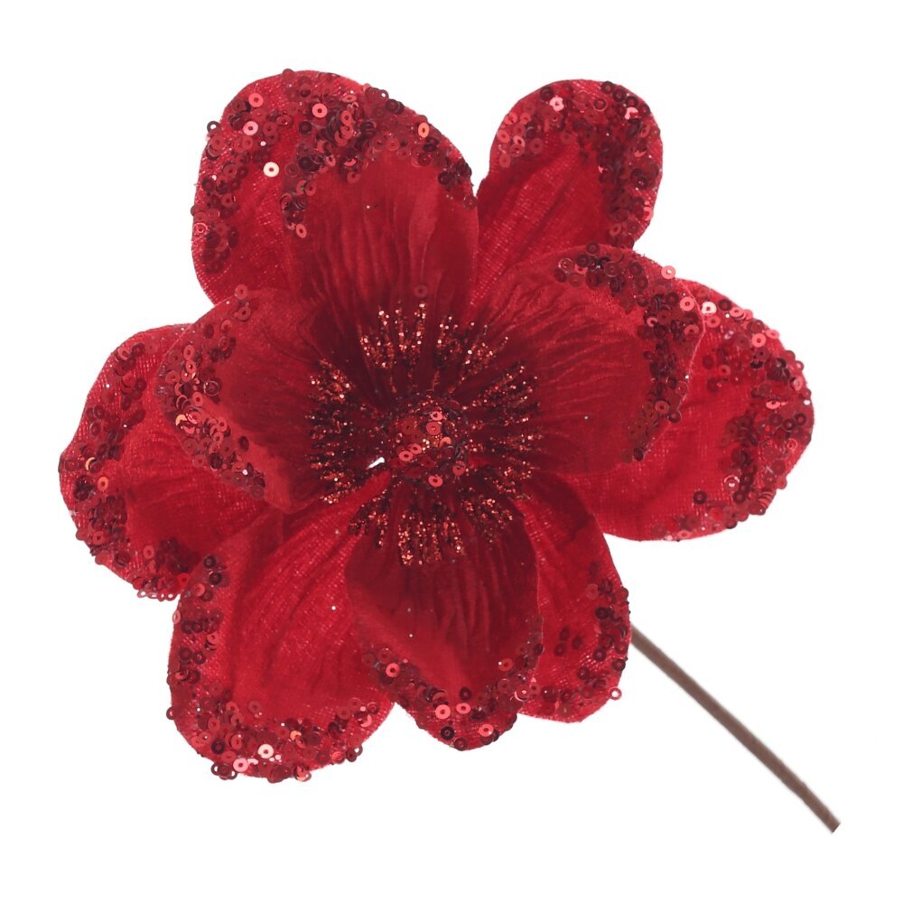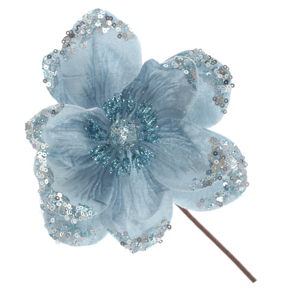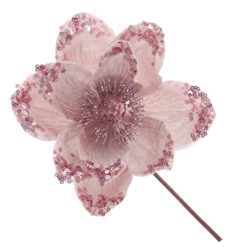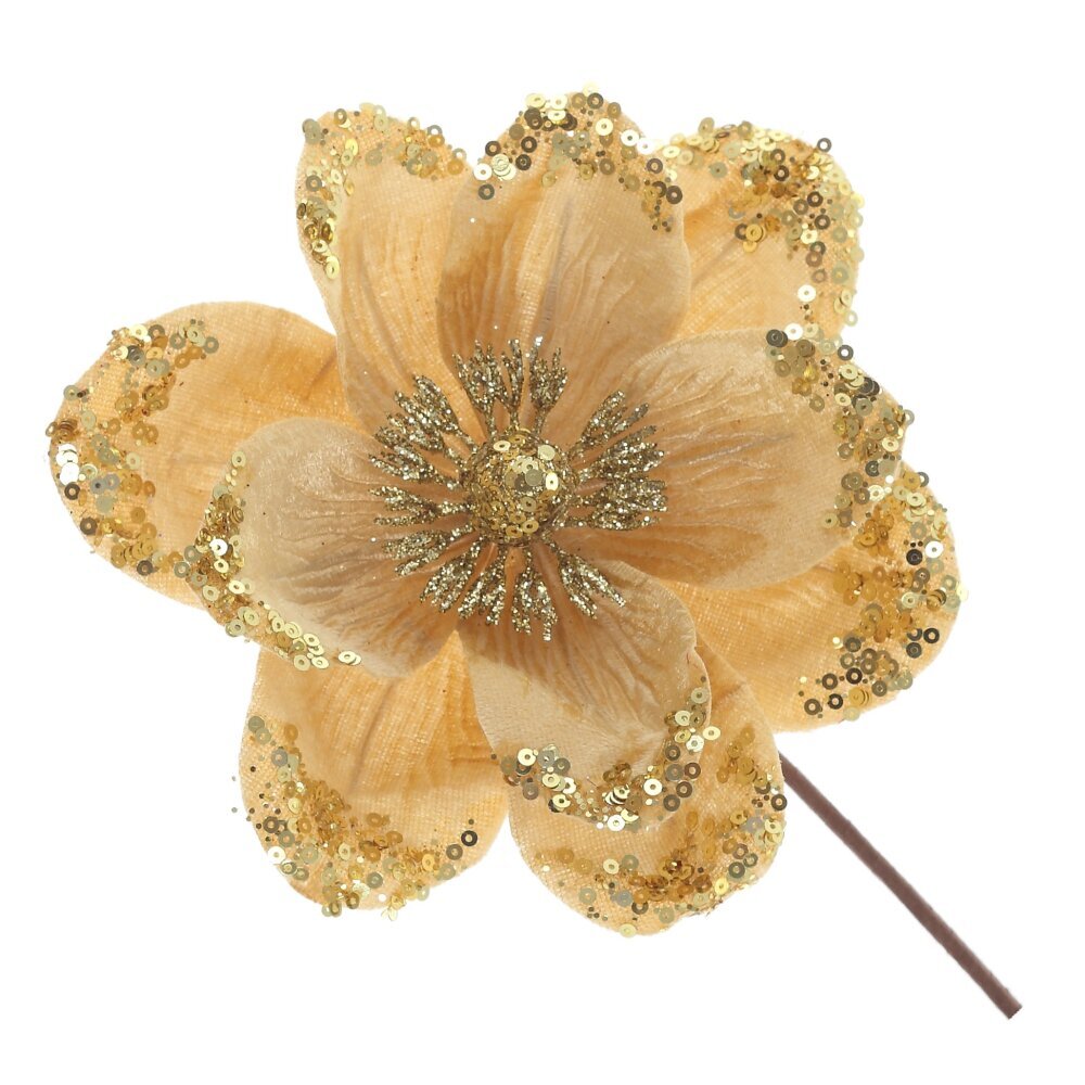 Изысканное новогоднее украшение — искусственный цветок магнолии, выполненный из бархатистой ткани, станет великолепным акцентом праздничного декора. Мягкая фактура лепестков придаёт цветку утончённый и благородный вид, создавая ощущение тепла и уюта. Украшение дополнено блестящими пайетками, которые переливаются при свете гирлянд и свечей, создавая атмосферу волшебства и праздника. Цветок можно использовать для оформления новогодней ёлки, праздничных венков, композиций на стол или в интерьере. Он прекрасно впишется в классический, винтажный или современный стиль, добавляя нотку роскоши и элегантности.