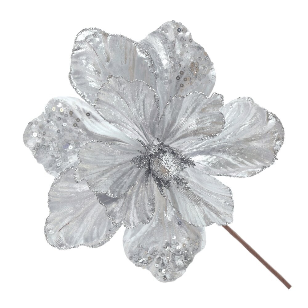 Изысканное новогоднее украшение — искусственный цветок магнолии, выполненный из бархатистой ткани, станет великолепным акцентом праздничного декора. Мягкая фактура лепестков придаёт цветку утончённый и благородный вид, создавая ощущение тепла и уюта. Украшение дополнено блестящими пайетками, которые переливаются при свете гирлянд и свечей, создавая атмосферу волшебства и праздника. Цветок можно использовать для оформления новогодней ёлки, праздничных венков, композиций на стол или в интерьере. Он прекрасно впишется в классический, винтажный или современный стиль, добавляя нотку роскоши и элегантности.