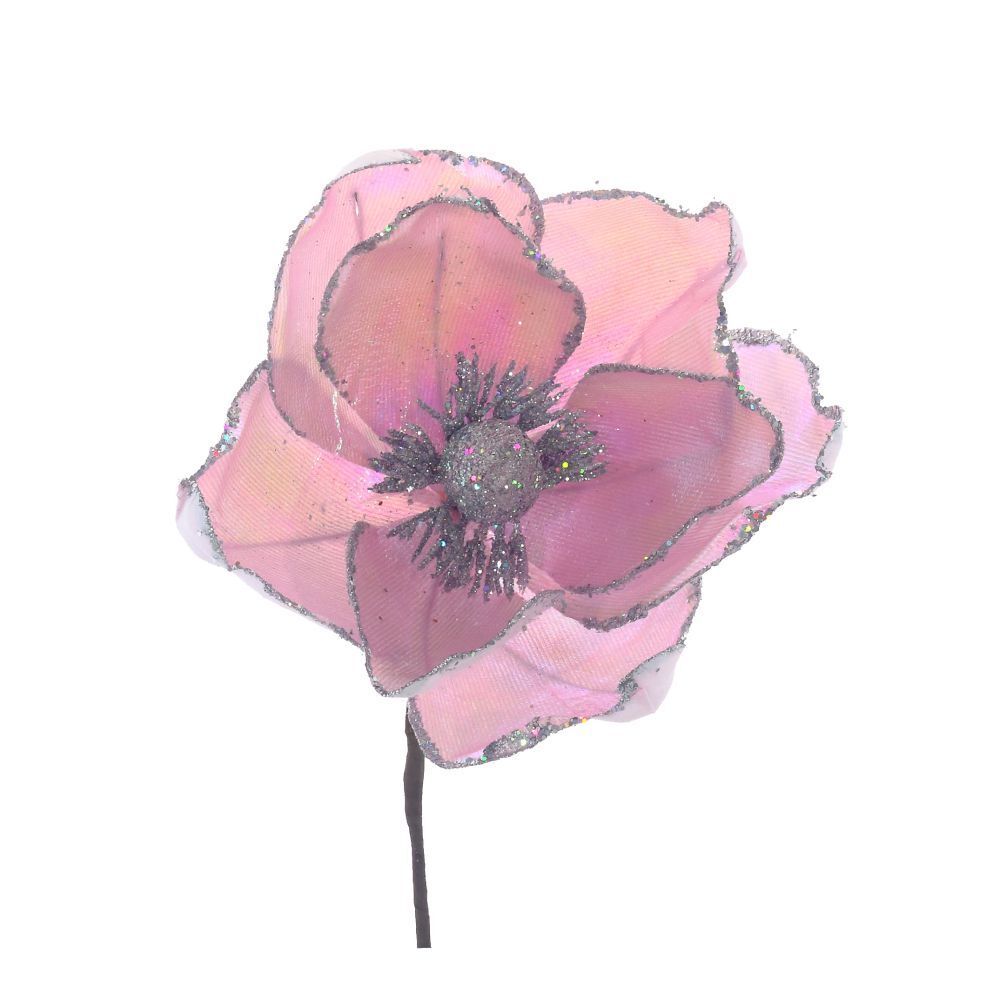 С ролью украшения новогодней ели прекрасно справится этот искусственный цветок. Магнолия розового цвета. Благородность цветка подчеркивают серебряные блестки по краям и в середине.