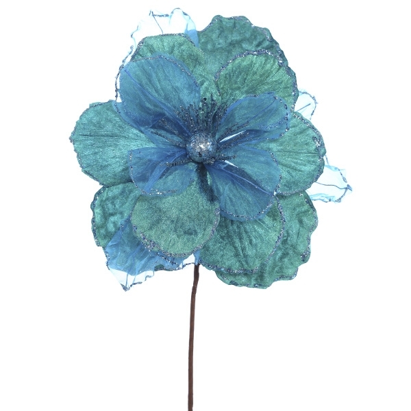 Елочное украшение - цветок могнолия эффектного голубого цвета, станет изысканным дополнением праздничного декора. С таким украшением новогодняя атмосфера заиграет свежими красками.