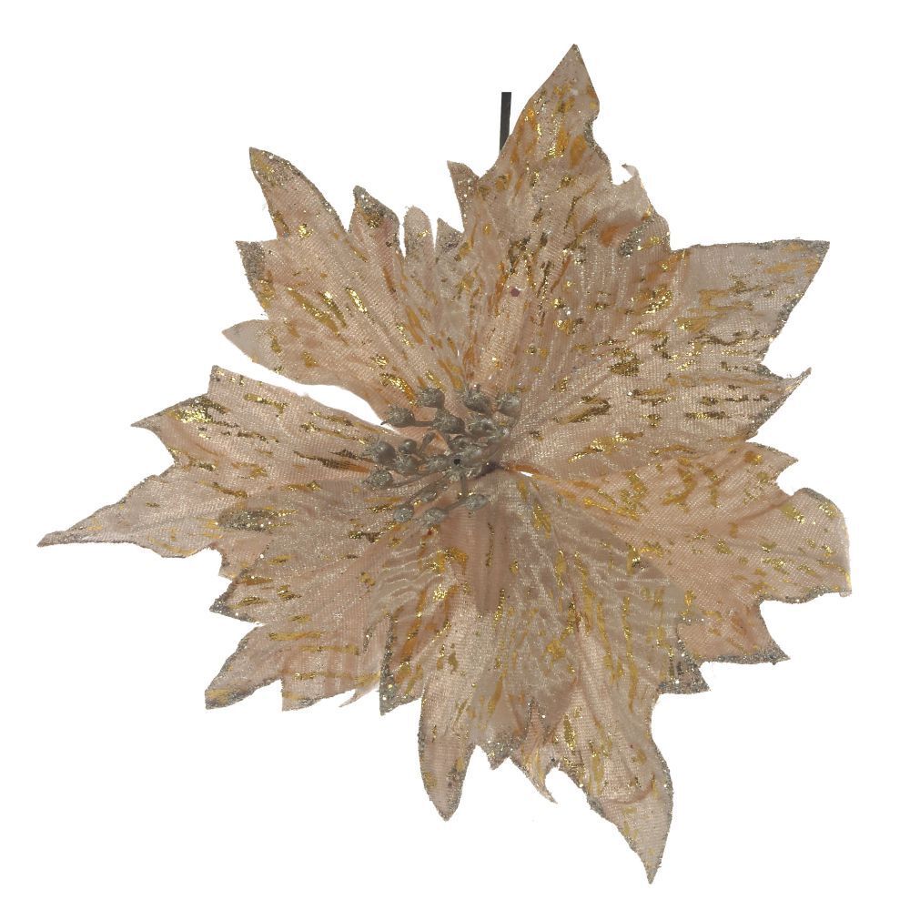 Нежная рождественская пуансетия. Лепестки выглядят невероятно эффектно: на их кончиках мерцает россыпь блесток, сердцевина состоит из бусинок. Прикрепите этот стильный новогодний цветок на елку и она заиграет яркими красками.