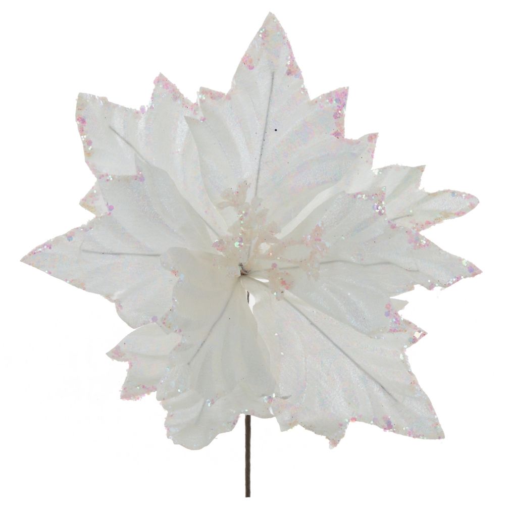 Рождественская пуансеттия. Лепестки выглядят невероятно эффектно: на их кончиках и серцевине мерцает россыпь блесток. Прикрепите этот стильный новогодний цветок на елку и она заиграет нежностью.