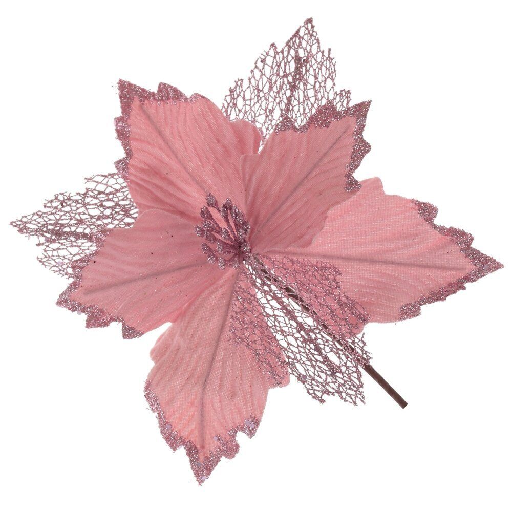 Искусственная пуансеттия смотрится очень волнующе, а усыпанные мелкими блестками лепестки сияют и переливаются от светящихся огоньков новогодней елки.