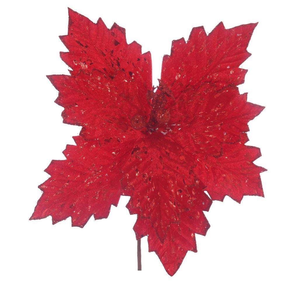 Искусственная пуансеттия смотрится очень волнующе, а усыпанные мелкими блестками лепестки сияют и переливаются от светящихся огоньков новогодней елки.