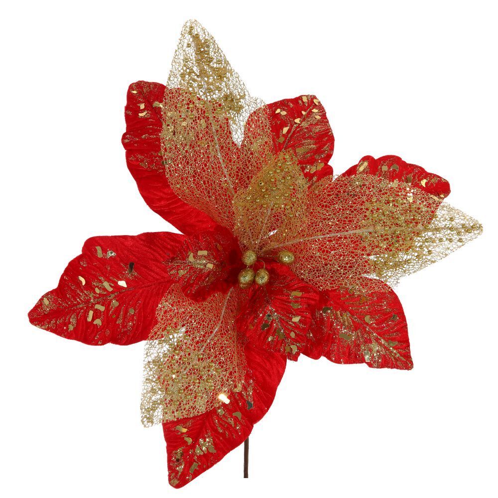 Искусственная пуансеттия смотрится очень волнующе, а усыпанные мелкими блестками лепестки сияют и переливаются от светящихся огоньков новогодней елки.
