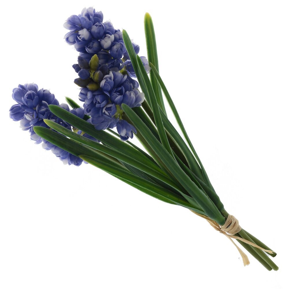 Искусственный букет гиацинтов – изящная декоративная композиция, выполненная из качественных полимерных материалов. Плотные соцветия глубокого сине?фиолетового оттенка и узкие глянцевые листья выглядят естественно и аккуратно, стебли объединены светлой бечёвкой. Букет не требует ухода, не вянет и надолго сохраняет форму и цвет, достаточно периодически протирать пыль сухой или слегка влажной салфеткой. Идеален для оформления интерьера дома, офиса, витрин, фотозон и праздничных композиций. Компактный и универсальный, легко впишется в классические и современные вазы, создавая ощущение свежести и весеннего настроения круглый год.