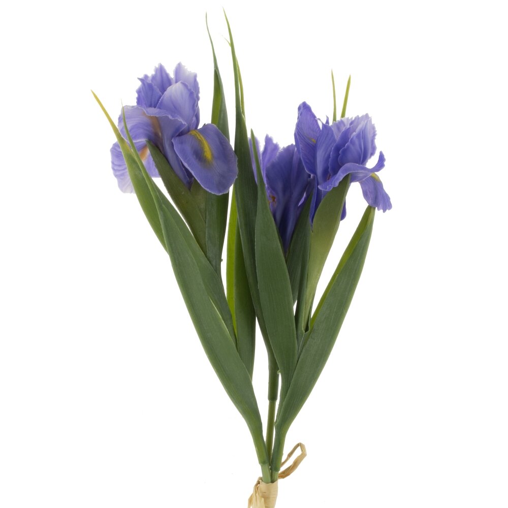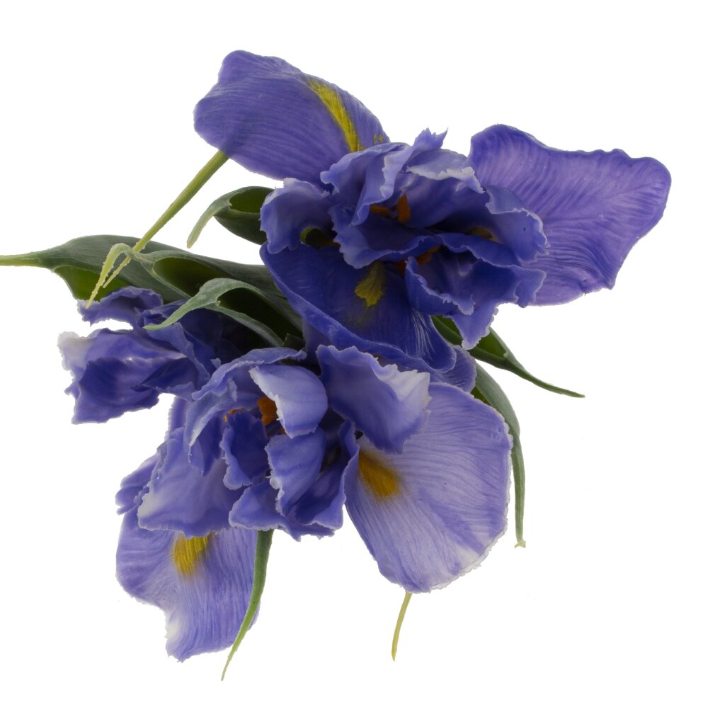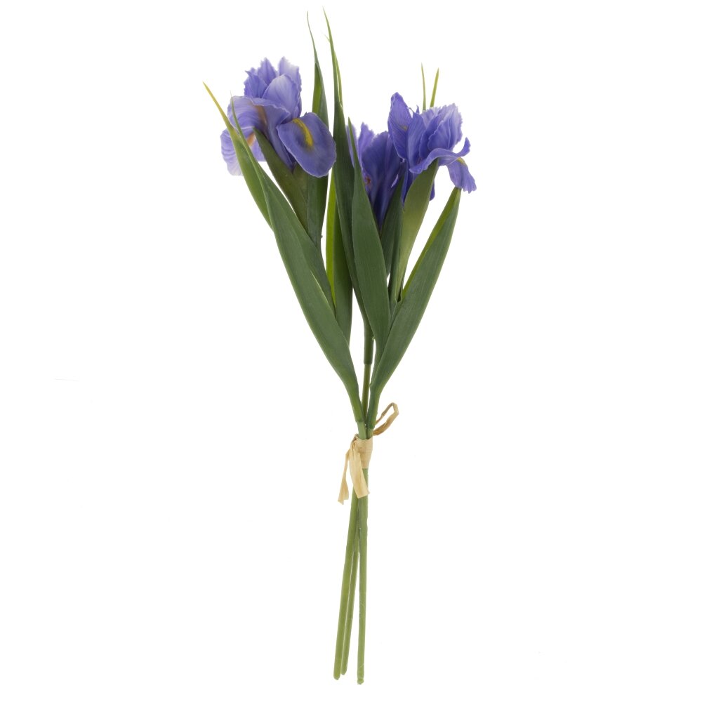 Искусственный букет ирисов — изящная композиция из нескольких стеблей с насыщенно-фиолетовыми цветками и узкими зелеными листьями. Лепестки с мягкими волнами и деликатной желтой прожилкой передают естественную фактуру живого ириса, стебли аккуратно перевязаны лентой. Полимерные материалы приятны на ощупь, держат форму, не боятся влаги и солнечного света, не выцветают и не требуют ухода. Букет гармонично смотрится в компактной вазе, стакане или кашпо, станет акцентом в гостиной, спальне, офисе, витрине или на праздничном столе и подходит для фотозон и декоративных композиций.