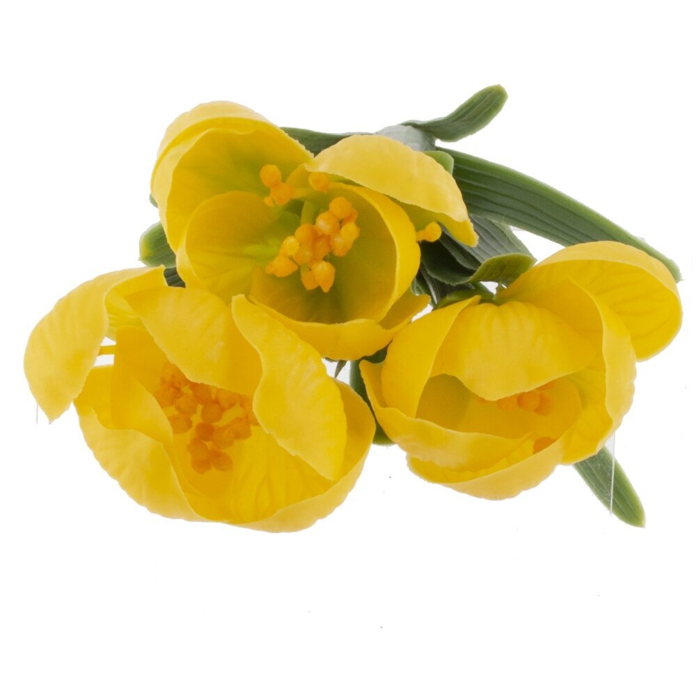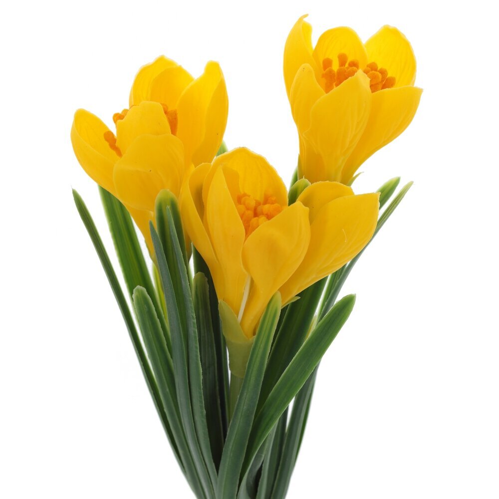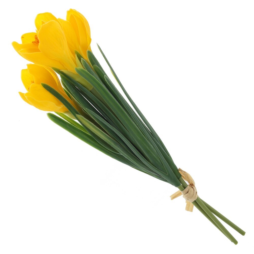 Искусственные цветы «Букет Крокусов» — элегантная композиция из полимерных материалов с реалистичной проработкой деталей. Нежные лепестки желтого оттенка и яркие оранжевые тычинки гармонично сочетаются с узкими насыщенно?зелёными листьями. Стебли собраны в аккуратный пучок и перевязаны светлой лентой, что добавляет композиции завершённости. Полимерные материалы долговечны, не выгорают и не боятся влаги, букет сохраняет форму и цвет без полива и особого ухода — достаточно периодически протирать пыль. Композиция универсальна: хорошо смотрится в вазе, настольных и напольных оформлениях, подходит для дома, офиса, витрин и фотозон, создавая свежую весеннюю атмосферу круглый год. Компактный размер позволяет использовать как самостоятельный акцент или комбинировать с другими декоративными элементами.
