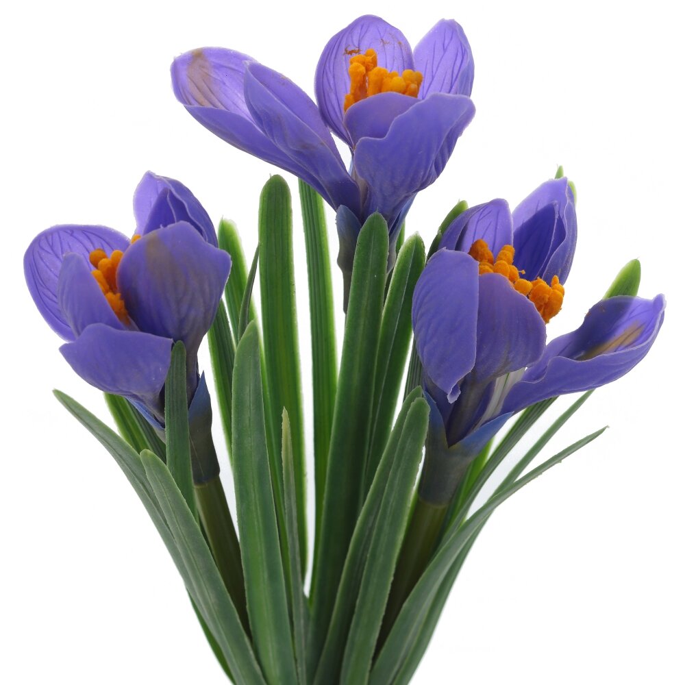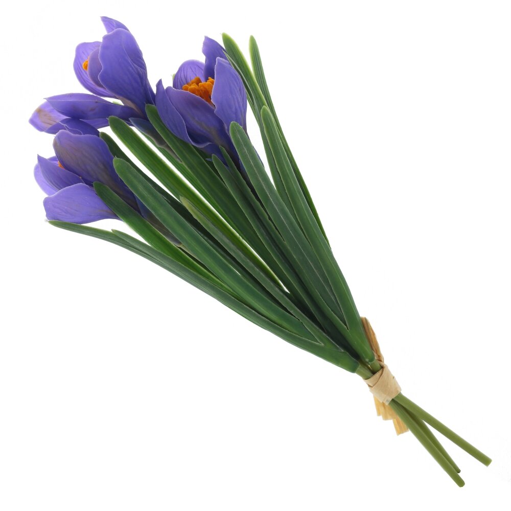 Искусственные цветы «Букет Крокусов» — элегантная композиция из полимерных материалов с реалистичной проработкой деталей. Нежные лепестки сиренево?фиолетового оттенка и яркие оранжевые тычинки гармонично сочетаются с узкими насыщенно?зелёными листьями. Стебли собраны в аккуратный пучок и перевязаны светлой лентой, что добавляет композиции завершённости. Полимерные материалы долговечны, не выгорают и не боятся влаги, букет сохраняет форму и цвет без полива и особого ухода — достаточно периодически протирать пыль. Композиция универсальна: хорошо смотрится в вазе, настольных и напольных оформлениях, подходит для дома, офиса, витрин и фотозон, создавая свежую весеннюю атмосферу круглый год. Компактный размер позволяет использовать как самостоятельный акцент или комбинировать с другими декоративными элементами.