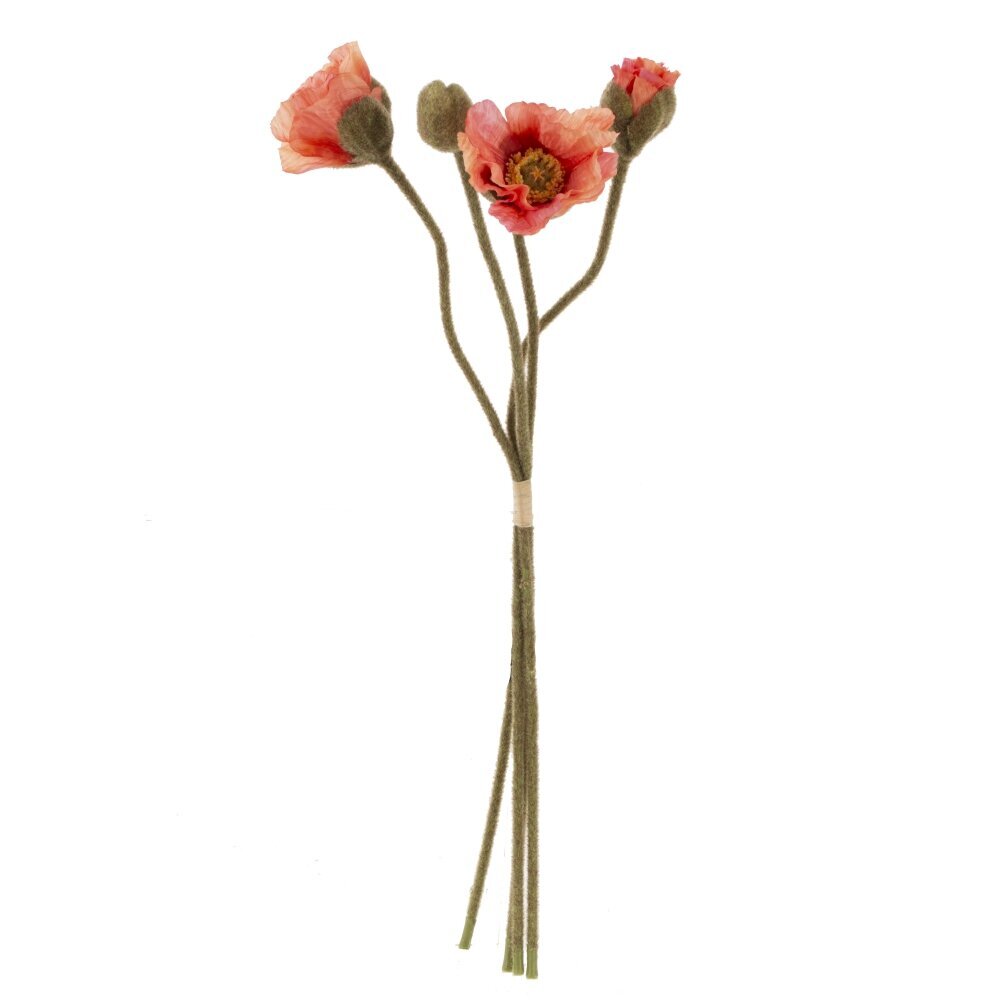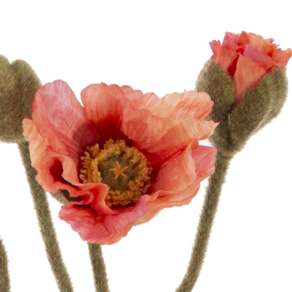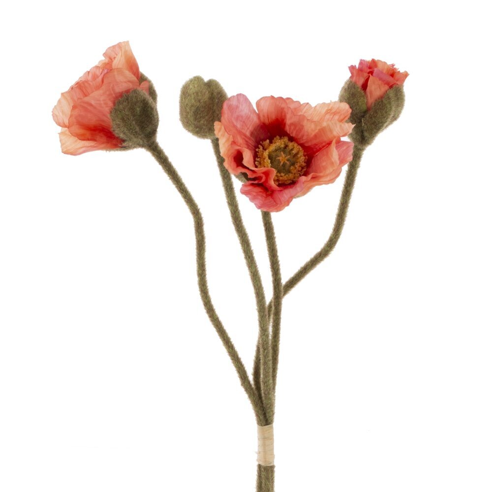 Искусственные цветы «Букет маков» — изящная композиция с нежными кораллово-оранжевыми соцветиями и бутонами. Лепестки и сердцевины выполнены из полимерных и текстильных материалов, что придаёт им естественную фактуру и мягкий полупрозрачный эффект. Стебли имеют металлическое армирование: их можно легко изгибать и придавать нужную форму в вазе или композиции. Букет не требует полива и особого ухода, долго сохраняет яркость, подходит для декора интерьера, фотозон, витрин и праздничных оформлений. Достаточно периодически протирать пыль сухой щёткой и беречь от длительного воздействия прямых солнечных лучей.