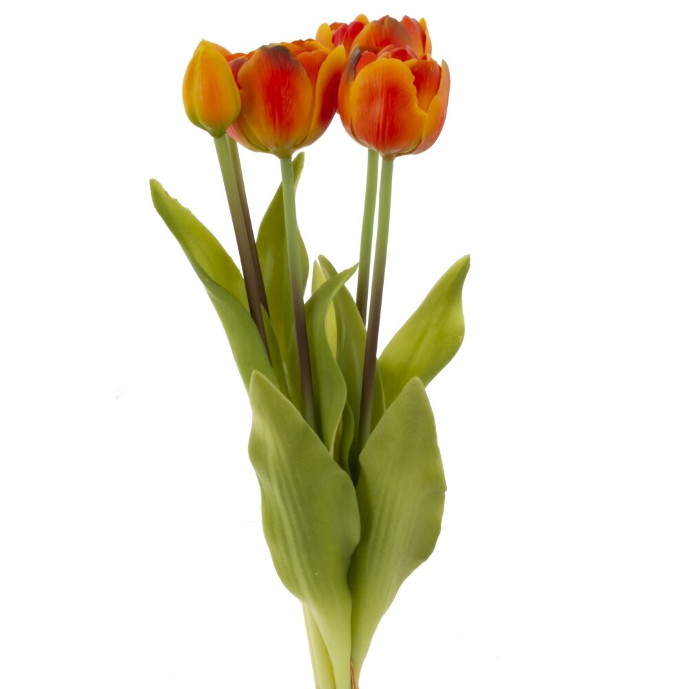 Букет искусственных тюльпанов, выполненный по технологии Real Touch, идеально имитирует натуральные цветы. Благодаря особому материалу лепестки на ощупь практически неотличимы от живых – они мягкие, эластичные и приятные на прикосновение. Яркие оранжево-красные бутоны и сочные зеленые листья создают жизнерадостное весеннее настроение. Такой букет станет украшением любого интерьера, прекрасно подойдет для подарка или декорирования праздничного стола. Искусственные тюльпаны не требуют ухода, долго сохраняют первоначальный внешний вид и не выцветают на солнце. Технология Real Touch придает флористической композиции максимальную реалистичность, что позволяет наслаждаться красотой тюльпанов круглый год.