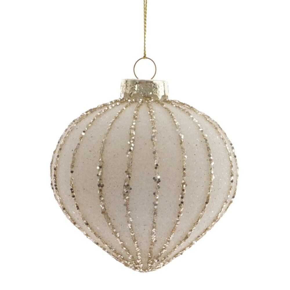 Новогоднее украшение "Капля" изготовлено из тонкого и прочного стекла, что делает его легким и удобным для подвешивания на елку. Оно покрыто белым глиттером, который имитирует искрящийся снег, создавая ощущение зимней сказки. Золотой глиттер, рассыпанный по поверхности шара, придает ему особый блеск и изящество, словно золотые нити в снежной пудре."Капля" будет прекрасно смотреться на елках любого стиля, придавая им ощущение волшебства и зимней красоты.